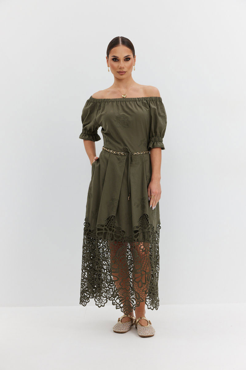 Платье из хлопковой ткани «ришелье». Длина макси. Платье отрезное по талии, юбка со складками. Верх с открытыми плечами и съемными бретелями. Застежка в боковом шве на потайную молнию. Рукав «фонарик». В боковых швах карманы. В комплекте декоративный пояс-завязка. Платье на подкладке.
