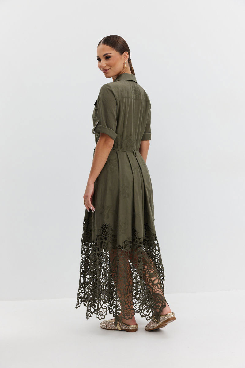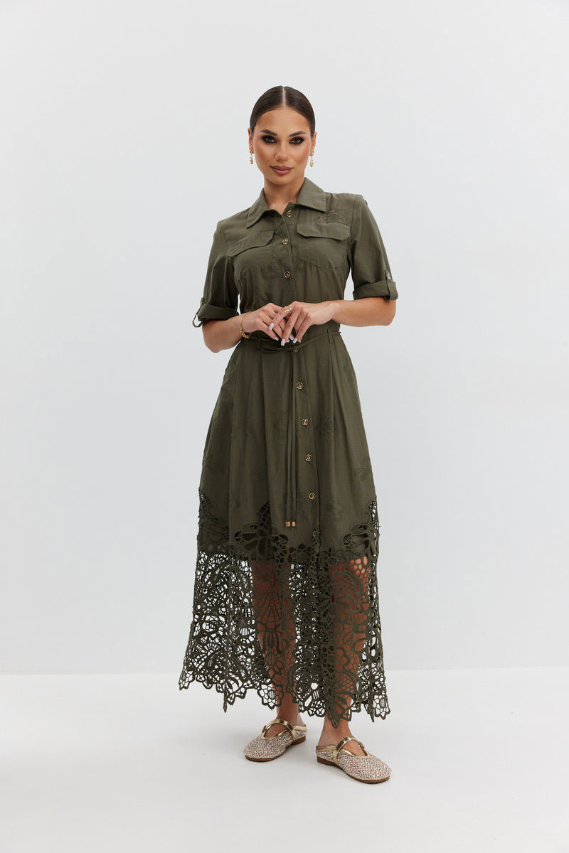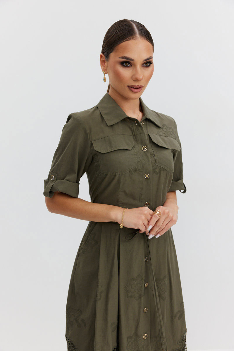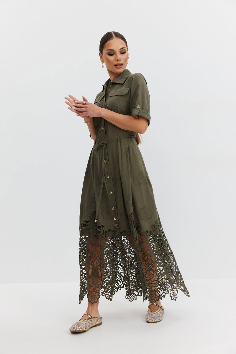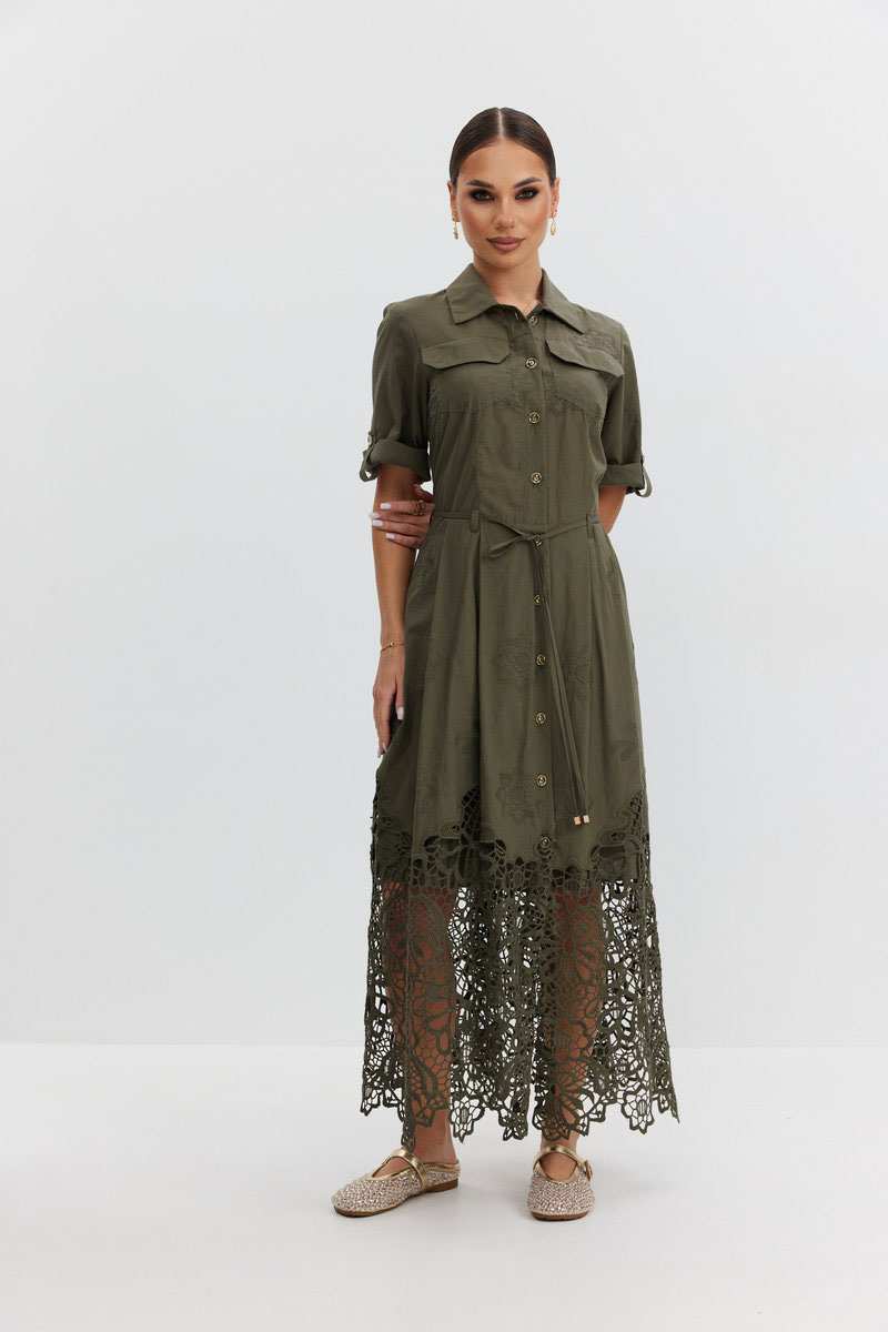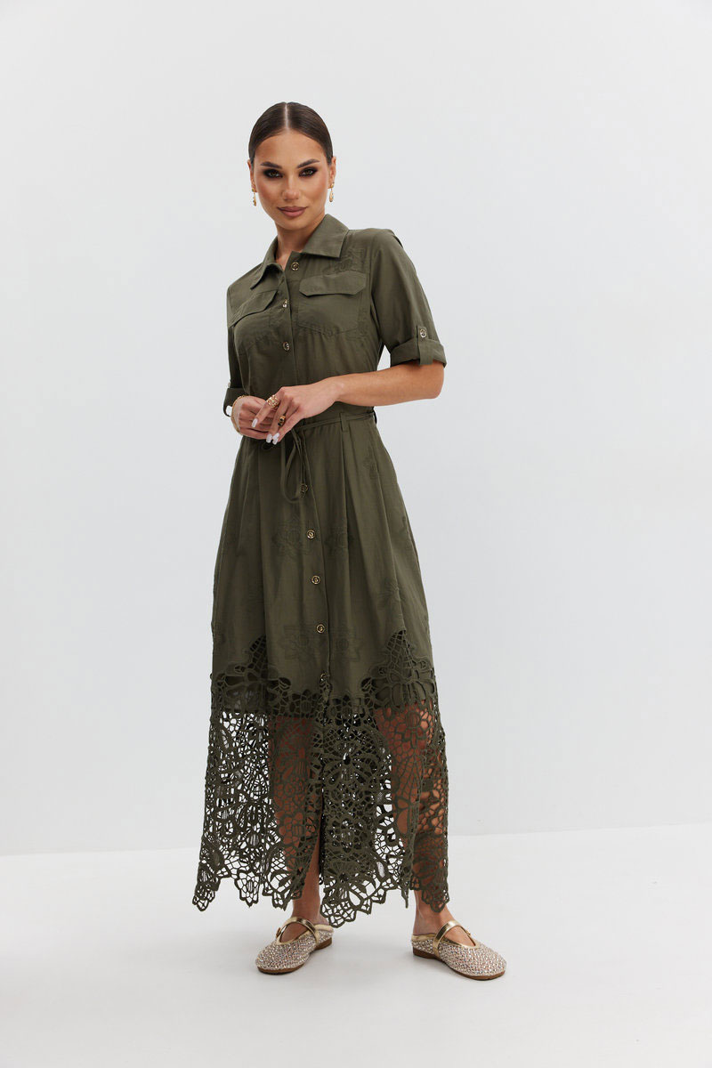 Платье из ажурной хлопковой ткани. Длина макси. Застежка на петли и пуговицы. Платье отрезное по талии. Воротник рубашечный. По переду накладные карманы с клапаном. Рукав прямой ¾ с