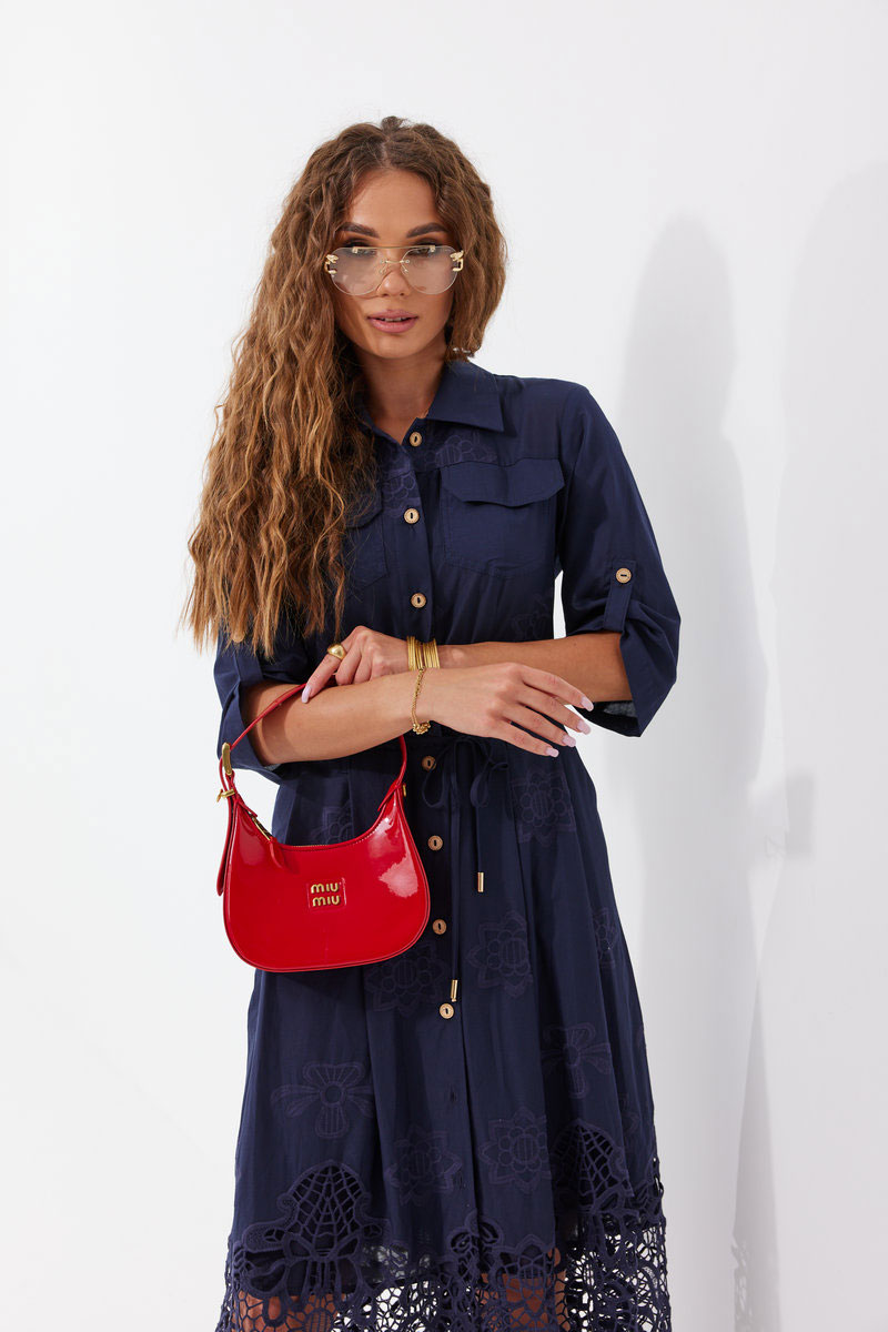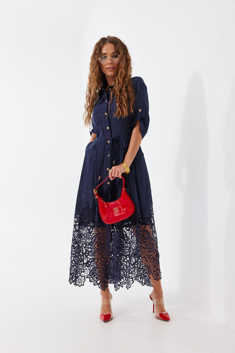 Платье из ажурной хлопковой ткани. Длина макси. Застежка на петли и пуговицы. Платье отрезное по талии. Воротник рубашечный. По переду накладные карманы с клапаном. Рукав прямой ¾ с