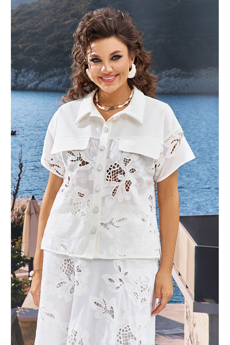 отделочной ткани. По спинке блузки отрезная кокетка из однотонной ткани. Линия плеча спущенная. Рукав втачной, короткий из ришелье. В боковых швах блузки разрезы. Воротник, планка,