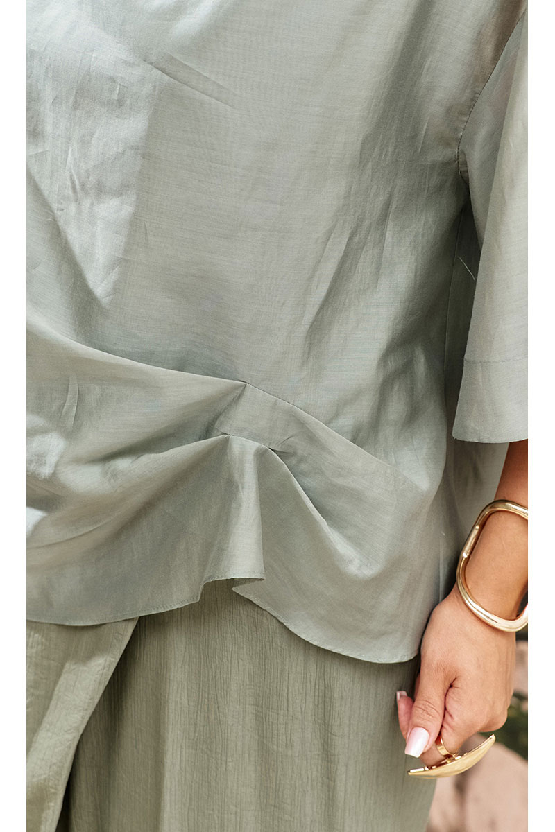 Блуза свободного кроя, с горловиной «лодочка». Рукава втачные, длиной чуть ниже локтя, со спущенной линией плеча. Блуза по переду декорирована защипами, создающими эффект асимметрии.