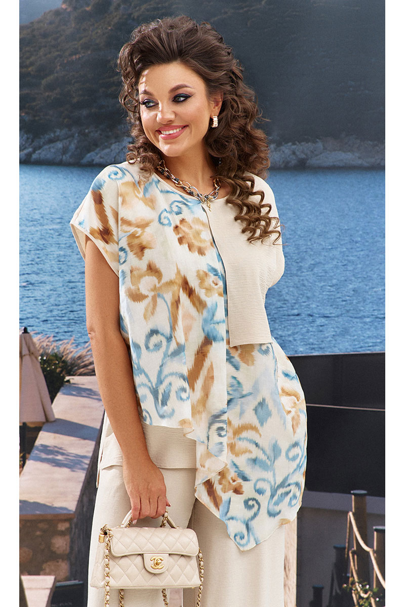 Блуза свободного силуэта с округлой формой горловины, отлетной деталью из однотона. По переду деталь из отделочной ткани с заложенной складкой у горловины и ассиметричным низом.