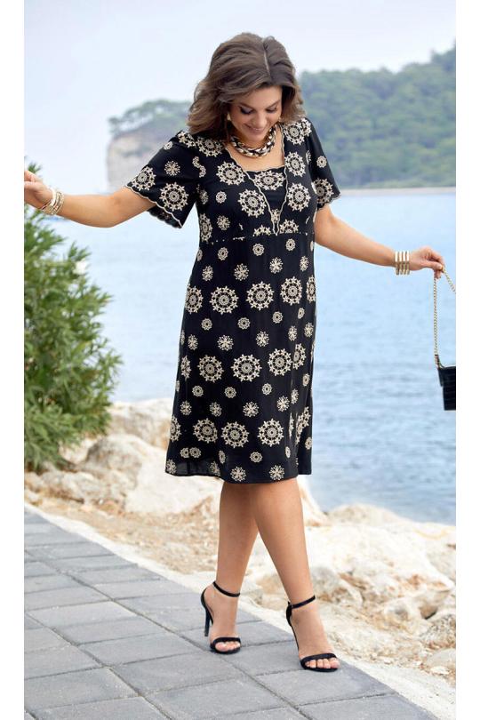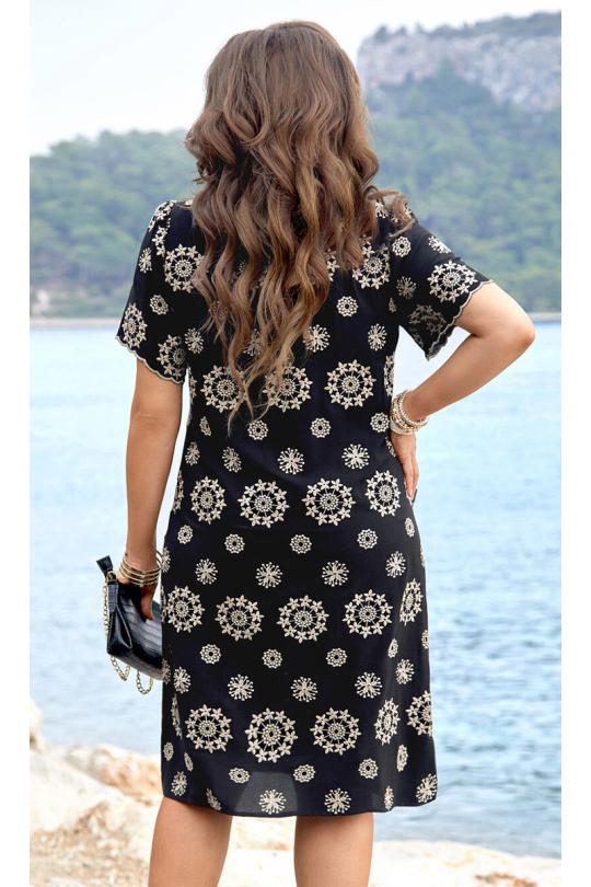 Летнее стильное женское платье с коротким рукавом - идеальное дополнение к гардеробу модницы. Это женственное платье с очаровательным вышитым дизайном идеально подходит для вечерних прогулок, отдыха, а также для работы в офисе. Сочетание чёрного цвета с бежевым дизайном придаёт платью своеобразную яркость. Платье без подкладки, длина плюс-минус середина колена (в зависимости от роста), расширяется к низу. По переду платья подрез под грудью и талиевые вытачки, горловина с V-образным вырезом, красиво выложенными фестонами, и треугольной вставкой. Рукав в платье короткий с фестонами по низу. Спинка в платье без особенностей. Низ в платье ровный.