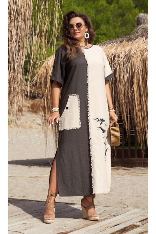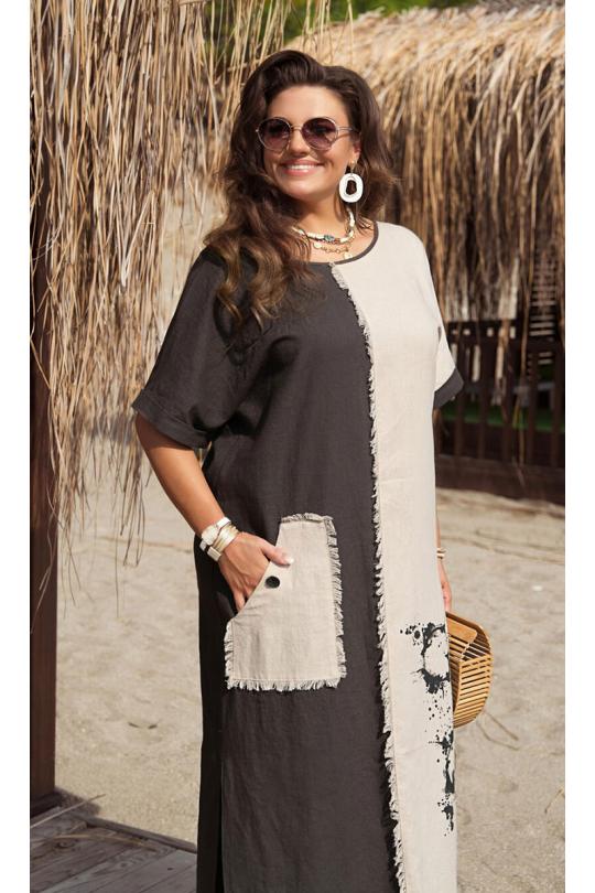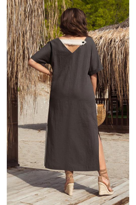 Платье женское идеально для жаркого лета, простой крой, не сковывающий движения. Платье сочетает в себе комбинацию контрастных цветов, а дизайнерская печать по детали переда добавляет яркий акцент. Платье прямого силуэта, длинное с высокими разрезами в боковых швах. Горловина в платье округлой формы, линия плеча, спущенная с притачной манжетой по низу. По переду платья вертикальный подрез со вставкой из бахромы, по правой половинке платья настрочной фигурный карман с декоративной отделкой в виде бахромы и декоративной пуговицы. Спинка с V-образным вырезом по горловине, притачной патой с декоративной отделкой в виде бахромы и декоративной пуговицы. Спинка со средним швом.