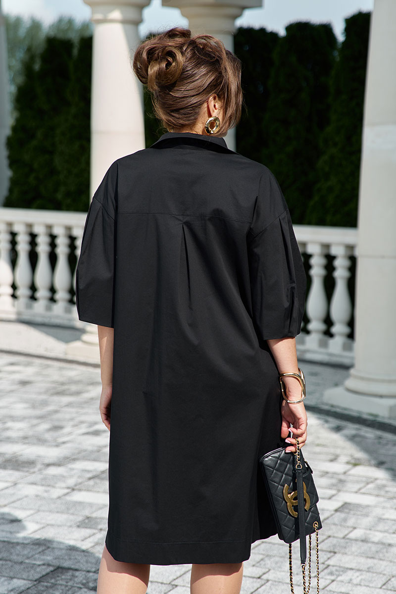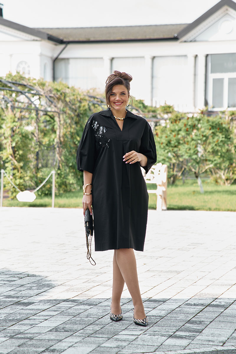 Однотонное платье имеет лёгкий блеск, переливается на свету. Левую часть плеча и груди украшает изысканная вышивка в тон. Длина миди делает его универсальным для различных мероприятий, а отсутствие четко выраженной талии позволяет платью мягко облегать фигуру. Платье А-силуэта, расширяется к низу, линия плеча спущенная. По переду платья вставка с плавным V- образным вырезом и широким отложным воротником. По переду платья застрачивается складка. По спинке платья притачная кокетка с застроченной складкой от подреза. Рукав втачной, в сгиб, с заложенными декоративными складками по окату и к низу. В боковых швах платья карманы. По низу платья широкая подгибка.