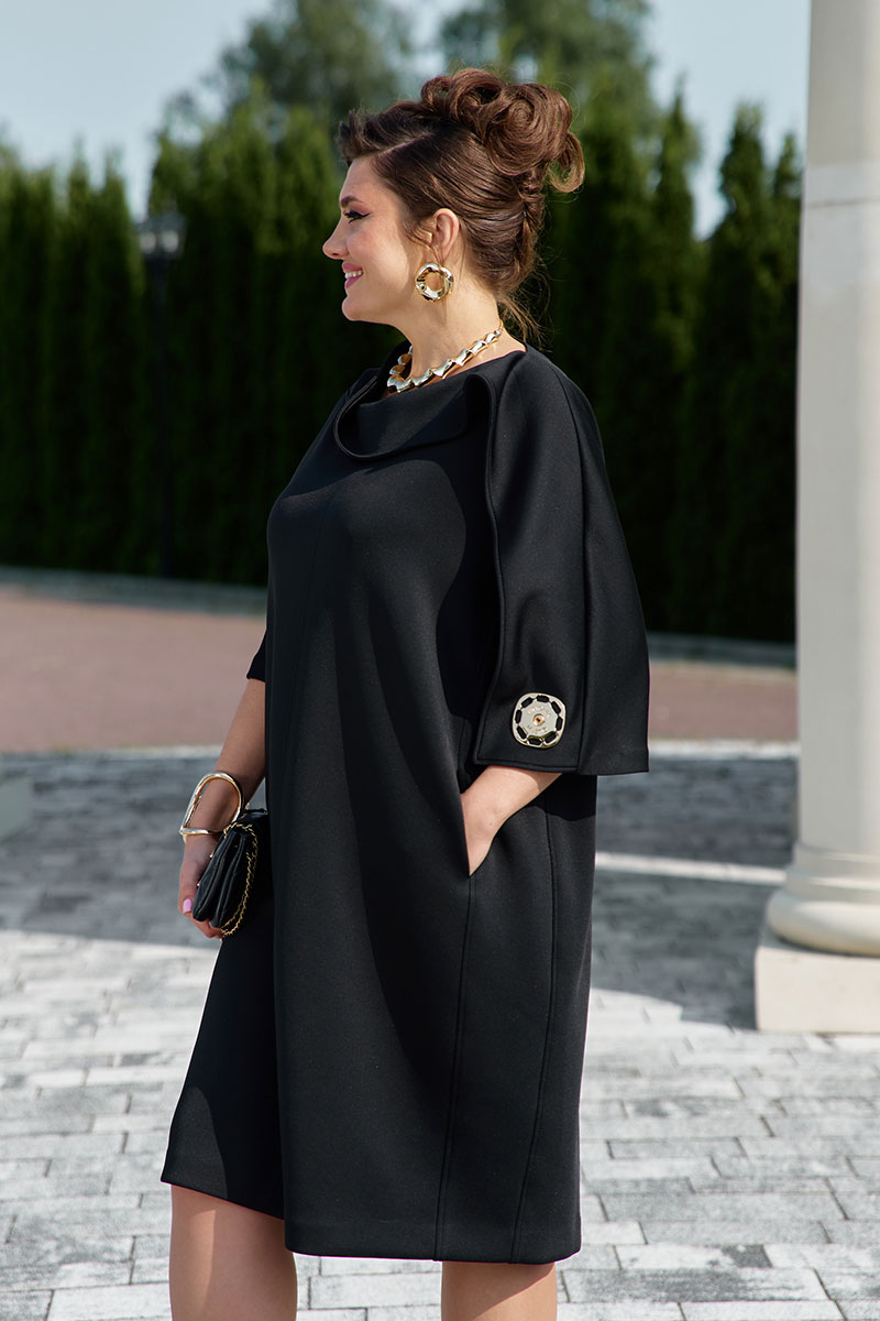 Платье, где каждый шов выверен до миллиметра. Глубокий, поглощающий свет чёрный цвет придаёт силуэту графичную чёткость, а фигурный воротник становится главным акцентом. Он начинается у горла изящным изгибом, затем плавно перетекает в рукав. Необычная форма воротника как скульптурный элемент, играющий с пропорциями, создаёт динамику: подчёркивает хрупкость шеи, скользит вдоль плеча и растворяется в линии рукава. Ткань — плотная, но податливая, сохраняя лаконичную элегантность. Платье не нуждается в украшениях — его силуэт говорит сам за себя. Это наряд для тех, кто ценит минимализм. Платье прямого силуэта со средним швом по переду и спинке, вставкой декоративных «бочков» с карманами в шве.Рукав в платье цельнокроеный, длиной ¾. Горловина в платье округлой формы оформлена декоративным ассиметричным воротником поп переду переходящим в шов на рукаве и фиксирующимся декоративной кнопкой по низу.