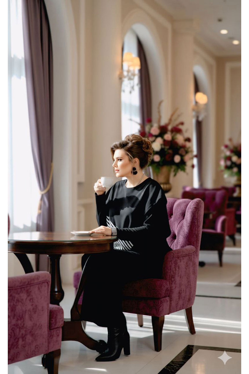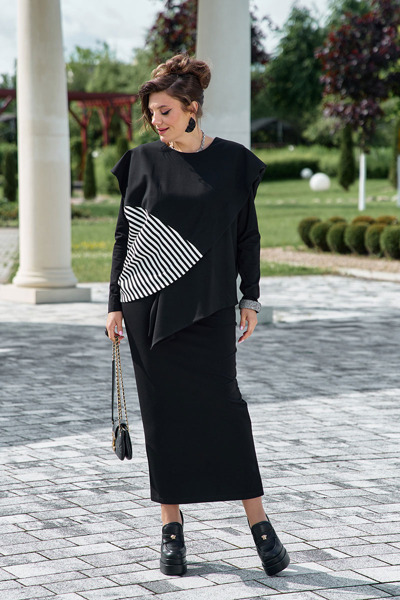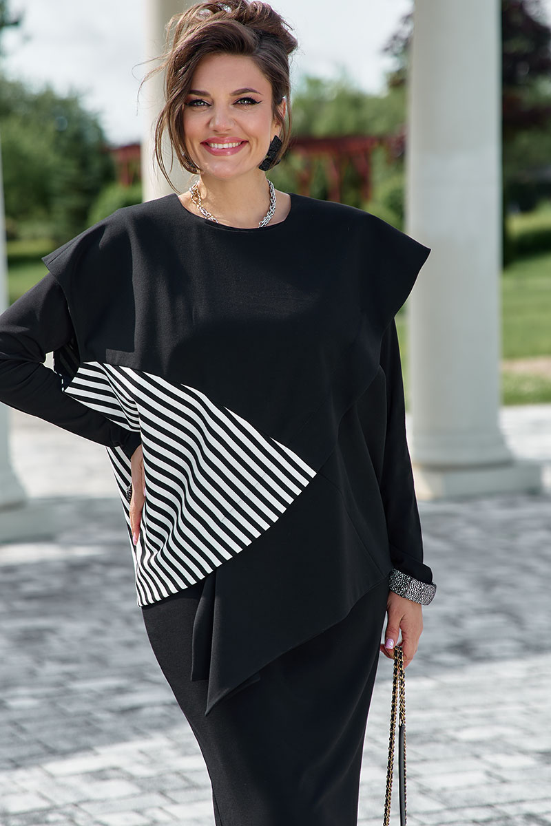 Асимметричный джемпер, объемный, его оверсайз-силуэт делает образ дерзким и одновременно изысканным. Горловина округлой формы, линия плеча спущена, линия проймы углублённая. По переду джемпера декоративная отлетная складка, фигурный подрез со вставкой из отделочной ткани в полоску преходящая на спинку. Низ завершает отлетная деталь — неструктурированный волан, который живет своей жизнью, колышется при каждом шаге, добавляя динамики и легкости массивному верху. Он не пришит намертво, он «отлетает», создавая ощущение незавершенности и художественного хаоса. Спинка в джемпере с застёжкой на декоративную тесьму молнию в среднем шве, декоративным подрезом. Низ спинки джемпера фигурной формы.