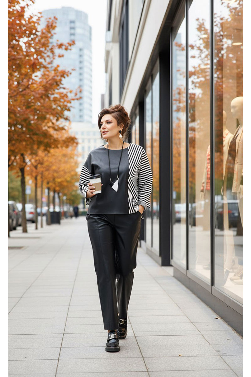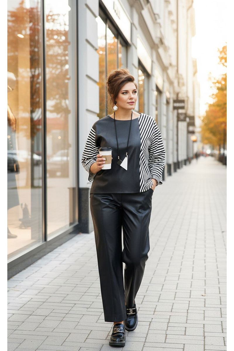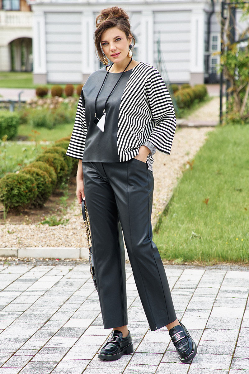 Брюки прямого силуэта из кожи с рельефами и отстрочкой по переду. По переду застежка на тесьму молнию в гульфике и пуговицу в поясе. По переду брюк наклонные карманы. Пояс притачной со вставкой эластичной тесьмы резинки в «бочках», что обеспечивает комфортную посадку на фигуру. Мягкая, но плотная кожа облегает фигуру, не стягивая её, а лишь подчёркивая женственные изгибы, добавляют образу элегантной строгости. В качестве дополнительного декоративного элемента в комплекте идёт декоративное украшение.