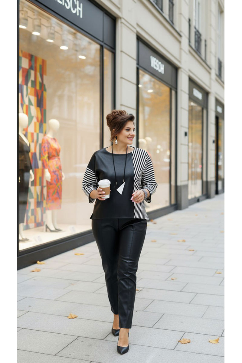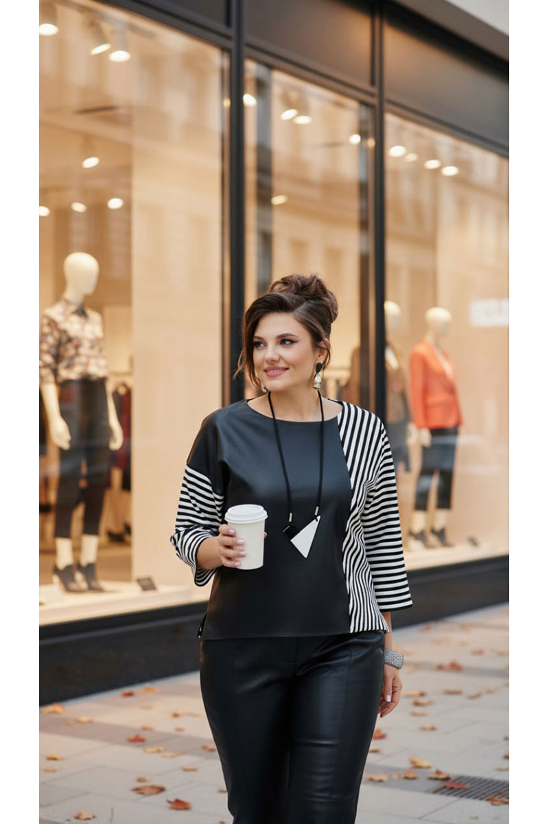 Блузон свободного силуэта, с вырезом горловины по форме «лодочка». По переду и спинке блузона вертикальный подрез смещённый влево от центра со вставкой из отделочного материала. Рукава в блузоне разных видов- левый цельнокроеный, длиной 7/8; по правой стороне линия плеча спущенная, рукав втачной, из отделочной ткани, длиной 7/8. Низ ассиметричный, в боковых швах от низа небольшие разрезы.