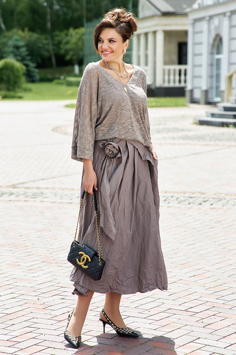 Юбка трапециевидного силуэтат. Объёмная, но не тяжеловесная, она играет с пропорциями, мягко округляясь на бёдрах и изящно расширяясь к низу. Ткань со сжатым эффектом добавляет динамики: то собирается в лёгкие складки, то разглаживается, будто дышит в такт шагам. Пояс в юбке притачной со вставкой декоративной тесьмы-резинки в бочках. По переднему полотнищу юбки от бокового шва закладывается декоративная складка с функциональным карманом. По заднему полотнищу брюк застёжка на потайную тесьму-молнию в среднем шве и пуговицу в поясе.