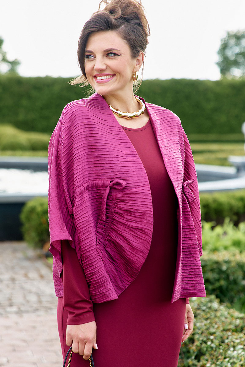 Главным акцентом комплекта является уникальный жакет-накидка из ткани гофре того же бордового цвета, что добавляет образу сложной текстуры и объема. Его свободный, асимметричный крой с декоративными завязками придает комплекту динамичность и оригинальность.