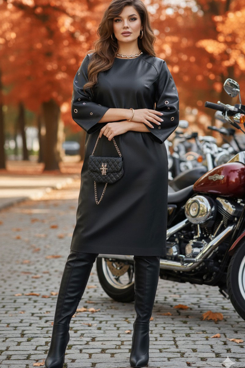 Платье полуприлегающего силуэта с округлой формой горловины. По переду платья нагрудные вытачки. По спинке застёжка на декоративную тесьму молнию в среднем шве платья и разрезом от низа. Рукава становятся главным акцентом: ряд люверсов и кнопок, выстроенных словно доспехи, придают образу дерзкий, почти урбанистический шик. Рукав в платье реглан, расширяется к низу, длиной 7/8. В боковых швах платье карманы.