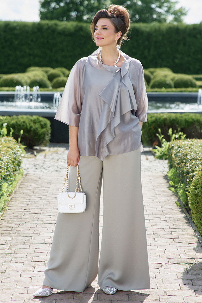 Элегантный брючный костюм, выполненный в мерцающем оттенке, который идеально подходит для создания утонченных образов. Комплект состоит из свободной блузы широких брюк палаццо, обеспечивая непревзойденный комфорт и легкость движений.