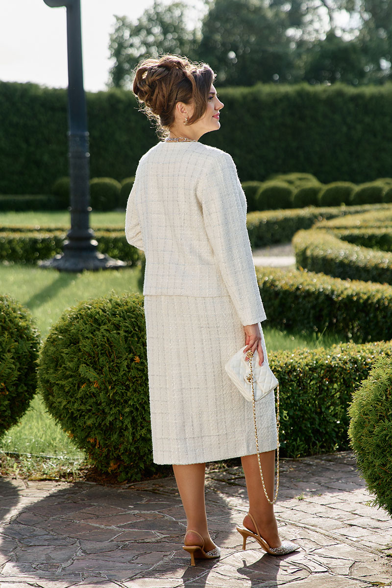 Жакет прямого силуэта с нагрудной вытачкой из низа и бочком. Застёжка однобортная на две петли и пуговицы с V-образной горловиной без воротника. Рукав полной длины двухшовный пиджачный. Спинка жакета с двумя талиевыми выточками. Юбка прямая зауженная к низу длины миди по переду комфортная шлица, задняя часть юбки со средним швом и потайной молнией в верхней части также талиевые вытачки.