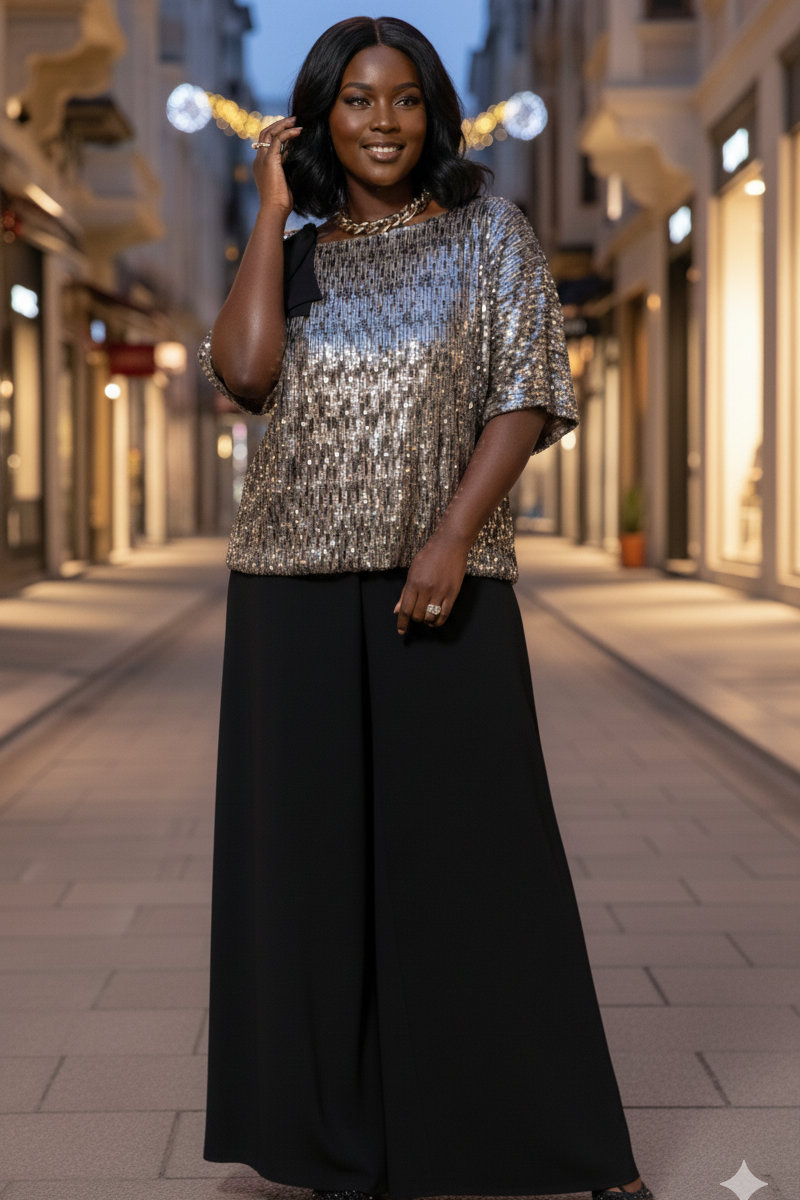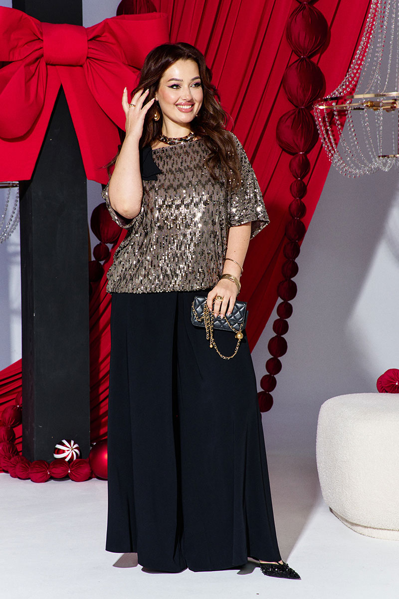 Это стильный и современный ансамбль, который состоит из блузы и брюк. Изысканный женский комплект идеален для торжественных мероприятий, он станет жемчужиной вашего гардероба. Брючный комплект можно дополнить минималистичными украшениями, которые подчеркнут утончённость, завершая этот элегантный, но уверенный образ. Сочетание классического чёрного цвета со сверкающими пайетками в одном образе превратит обыденное событие в настоящий феерический праздник!