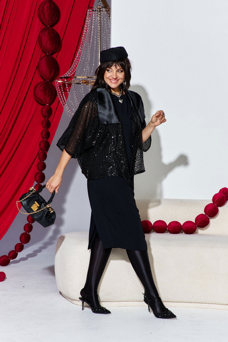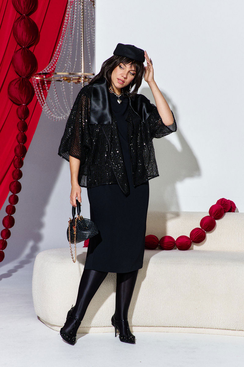 Комплект женский, состоящий из жакета и платья. Если Вы ищете идеальное сочетание стиля и комфорта, вот идеальный выбор. Мы специально подобрали качественную и тактильно приятную ткань, которая хорошо держит свою форму, создавая ощущение легкости и свободы движения. Стильный комплект - лучший выбор для тех, кто не боится самовыражаться и приковывать к себе взгляды окружающих. Жакет оверсайз жакет из чёрной сетки с мерцающей пайеткой и отложной атласный воротник, дополненный чёрным платьем-футляр. Жакет держится свободной линией на плечах, опускаясь до середины бедра. Сетка тонкая, полупрозрачная, но удерживает образ за счёт декоративной пайетки, которая мерцает точечными искрами. Пайетки распределены ровно и аккуратно, собирая свет в мелкие контуры по периметру каждого квадрата, создавая нежное, таинственное мерцание. Воротник ассиметричный, из гладкого атласа плавно ложится на плечи, добавляя комплекту строгий лоск и контраст матовой сетке. Его поверхность отражает свет иначе, чем сетка, подчеркивая линию шеи и проглядывая лоском на контрастной глубине ткани. Жакет с ассиметричной линией борта, отложным воротником из отделочной ткани. Линия плеча в жакете спущенная. Рукав втачной, длиной ¾. Спинка без особенностей. Жакет на подкладке.