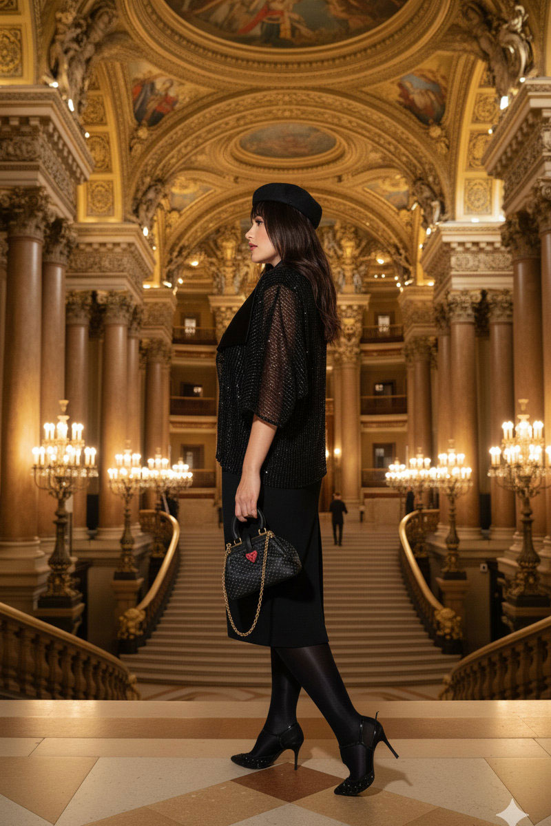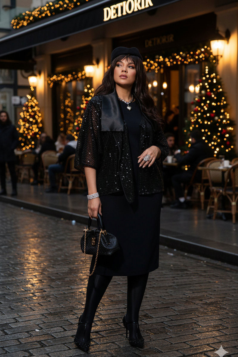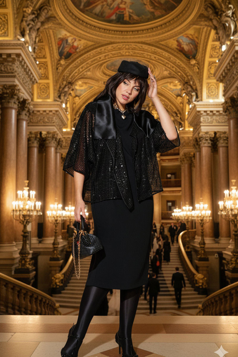 Плать-футляр, сознательно строгого кроя оно безупречно сидит по фигуре, подчеркивая талию и плавность бедра, но не перегружает образ, оставляя место для движения и дыхания ткани. Линия горловины в платье по форме «лодочка», с отрезными кокетками и талиевыми вытачками по переду. Линия проймы в платье фигурной формы, что придаёт изделию индивидуальности. По спинке платья отрезная кокетка и разрез в среднем шве от низа. Платье на подкладке. Образ держится на противоречии между полупрозрачной сеткой жакета и плотной безупречной вертикалью платья-футляр. Сочетание материалов создаёт эффект минималистичной, но насыщенной чувственности: сетка и пайетки добавляют лёгкость и игру света, тогда как платье добавляет силу и уверенность.