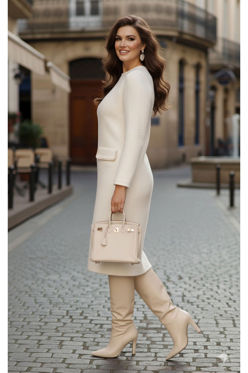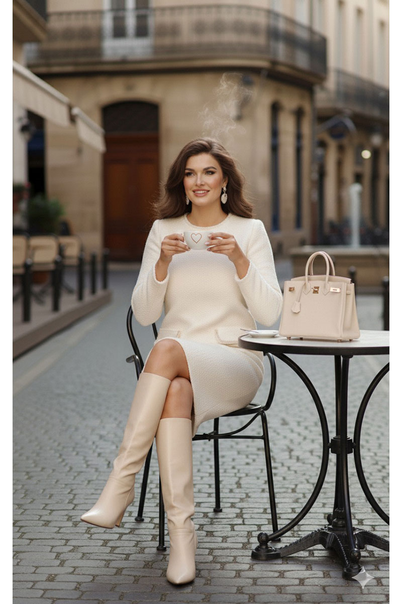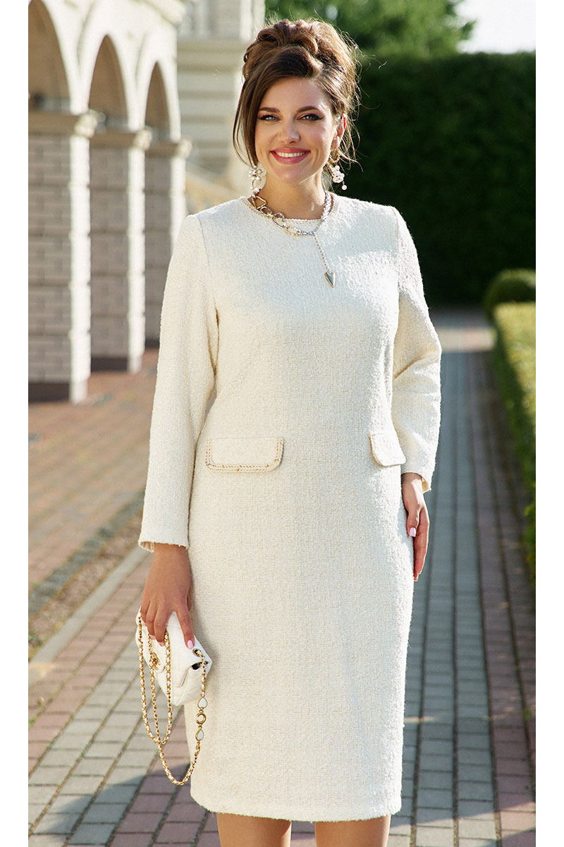 Безумно красивое и элегантное платье в модном оттенке «сливочного масла» мягко обволакивает фигуру, создавая тем самым шикарный образ. Его стиль, утончённость делает женщину поистине роскошной. Платье идеально подойдёт как для повседневной носки, так и для торжественных выходов, подчеркивает достоинства фигуры и успешно скрывает все недостатки. Платье прилегающего силуэта с округлой горловиной с отделкой в виде декоративной отделочной тесьмы. По переду платья нагрудные вытачки, отделочные клапана карманов с декоративной отделкой в виде тесьмы. По спинке застёжка на декоративную тесьму-молнию. Рукав в платье втачной, длинный. Платье на подкладке.