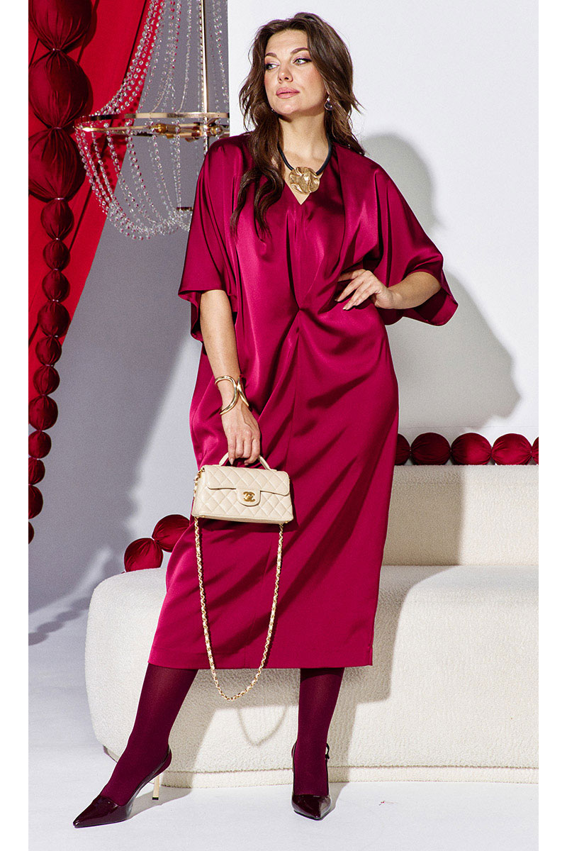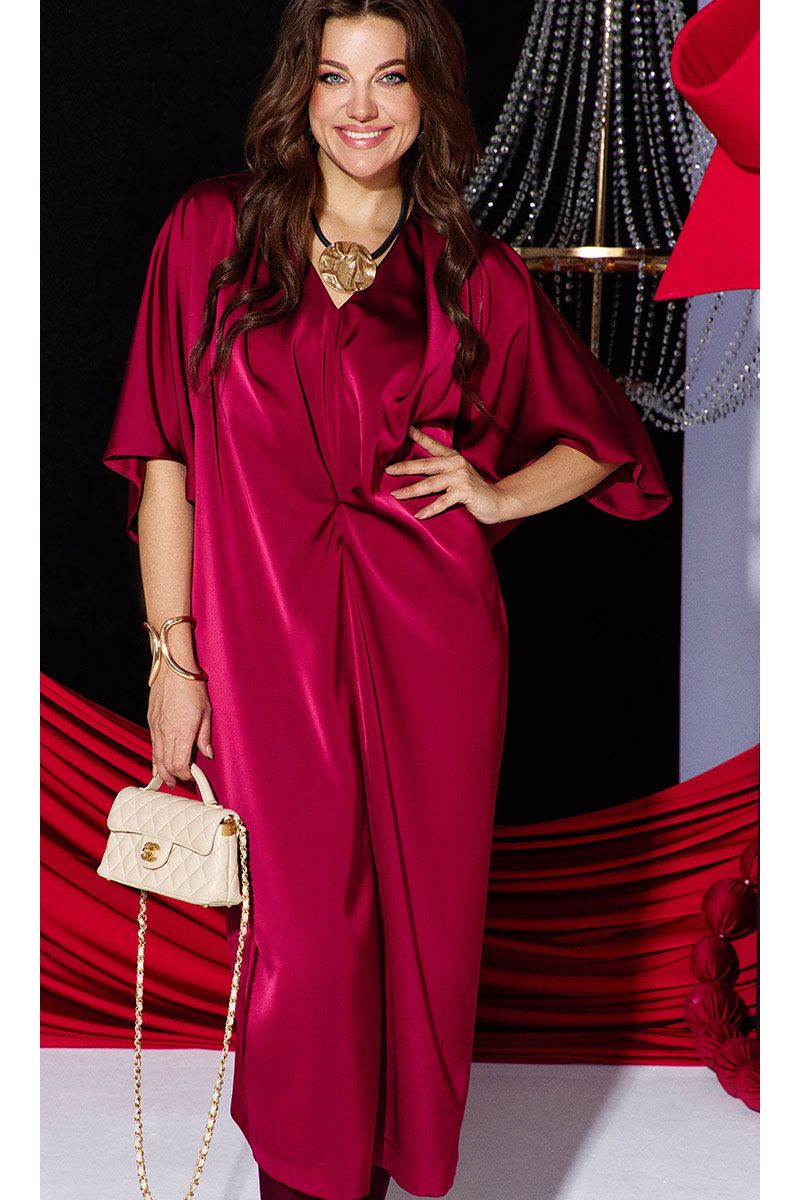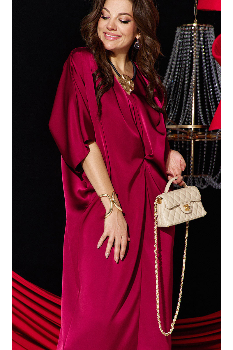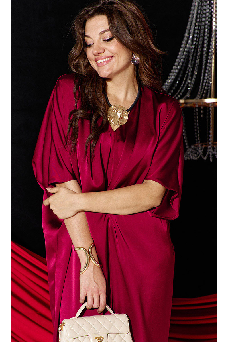 Это платье — олицетворение силы и изящности: ярко, но не кричаще. Уверенный, волнующий наряд для торжественных мероприятий и важных встреч. Силуэт «летучая мышь» мягко обтекает фигуру, создавая плавный переход между линией плеч и линией талии, затем свободно распускается по бокам, позволяя ткани играть волной при каждом движении. Вырез горловины V-образной формы подчёркивает изящную шею, а рукава добавляют образу лёгкую драматичность и женственность. По переду платья средний шов, с застроченной складкой выше уровня талии переходящую в складку по плечу. Спинка в платье со средним швом с разрезом от низа. Рукав в платье цельнокроеный со щеловидным вырезом проймы.