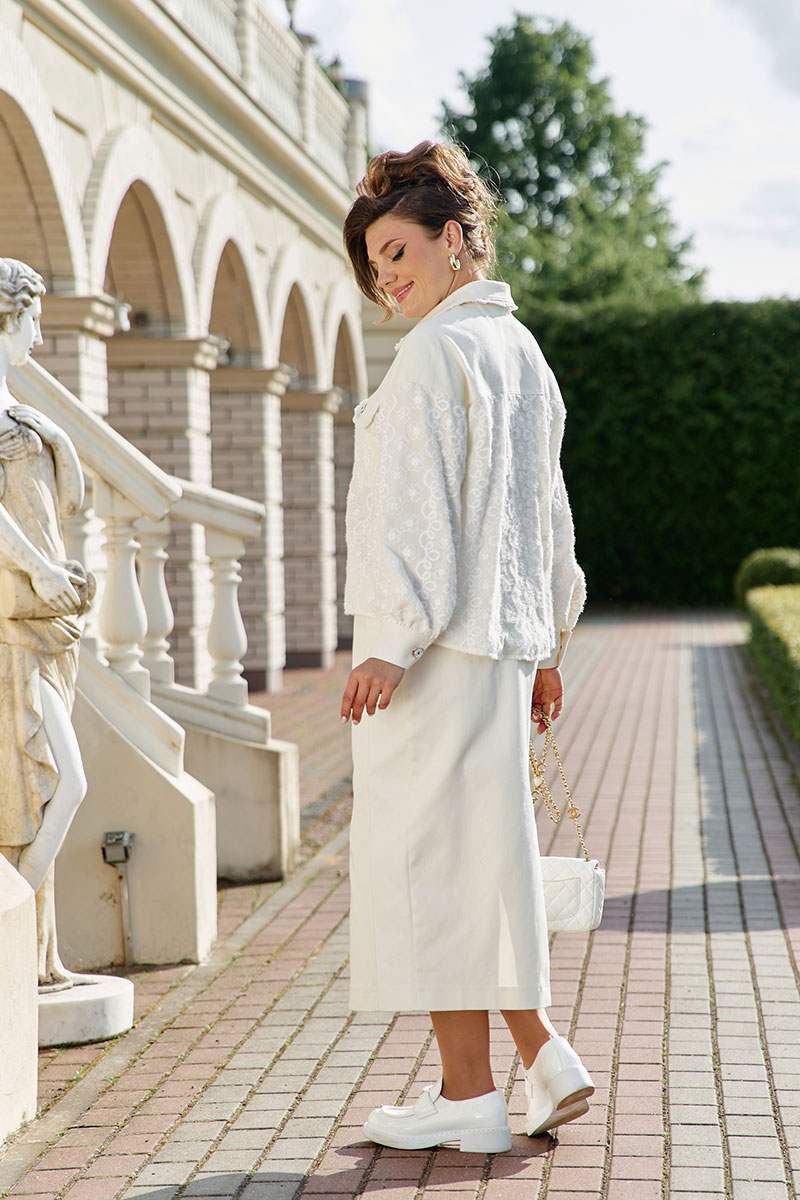Женский комплект, состоящий из жакета из джинсовой ткани в сочетании с прозрачной тканью в эффектную вышивку и юбки длины «миди».