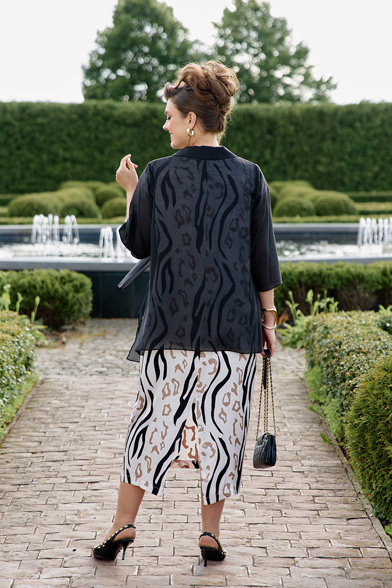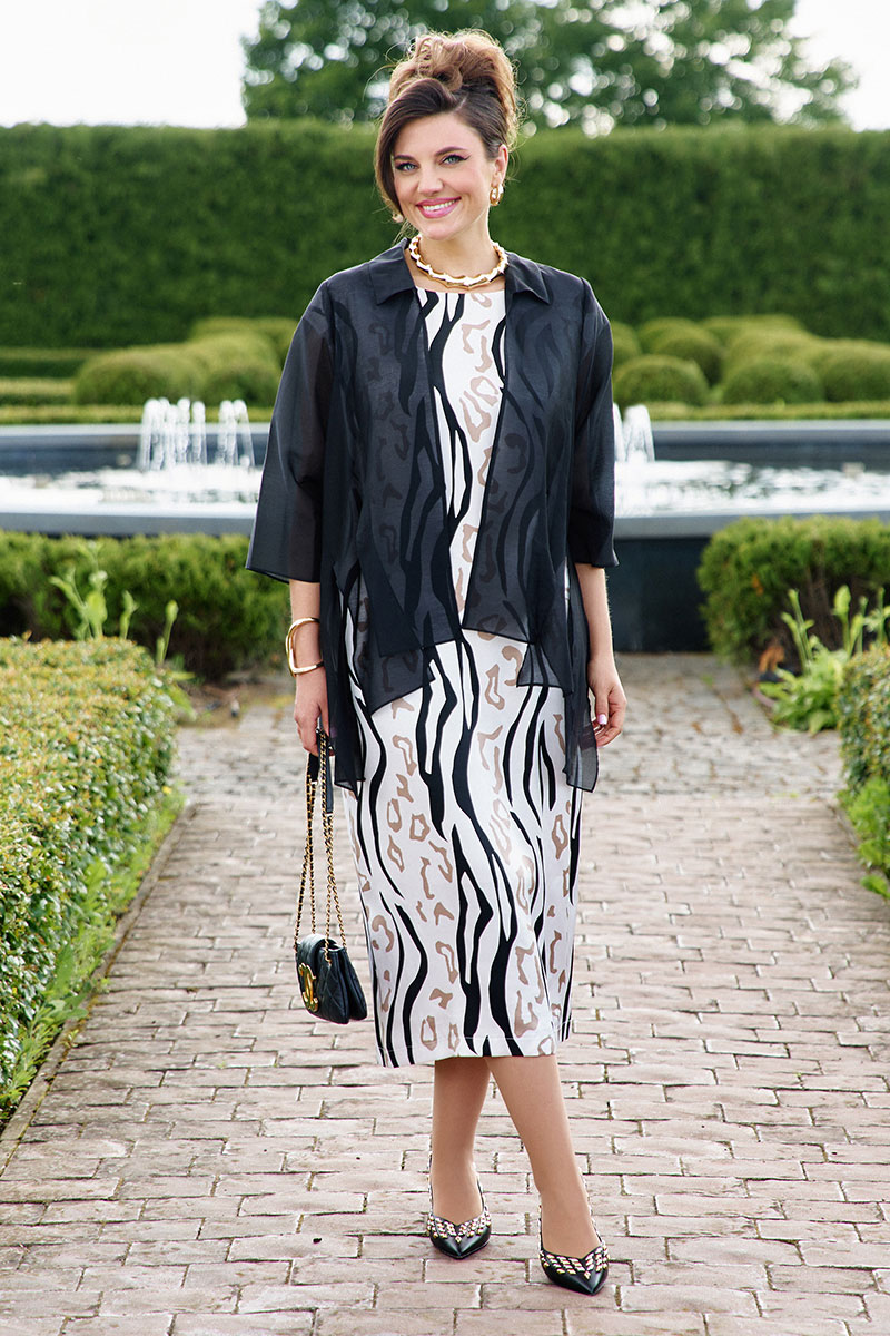 Комплект, состоящий из полупрозрачной блузки-накидки и платья с анималистическим принтом.