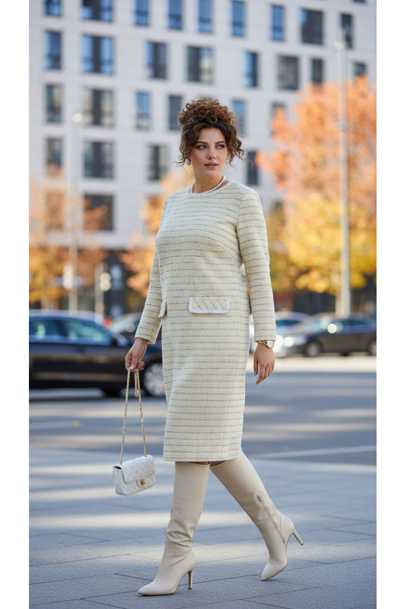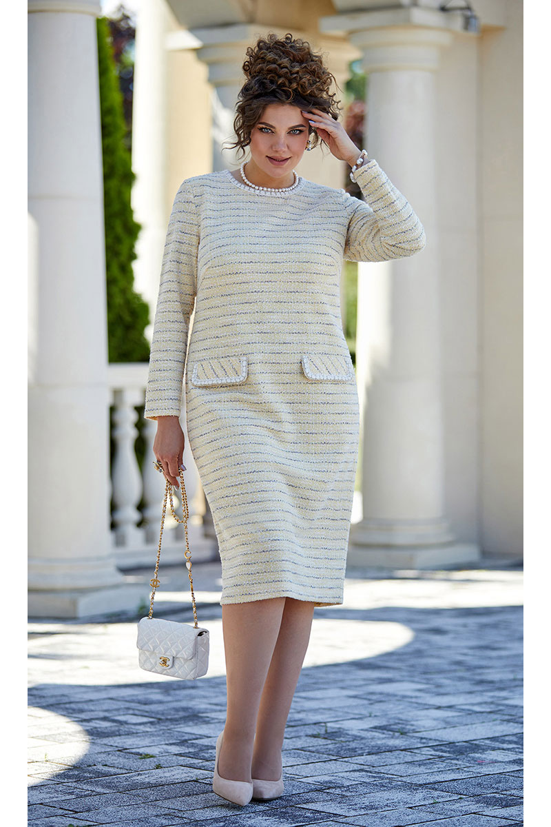 Стильное и комфортное платье из трикотажного полотна идеально подойдёт как для повседневной носки, так и для торжественных выходов. Платье подчеркивает достоинства фигуры и успешно скрывает все недостатки. Платье прилегающего силуэта длинны «миди» с округлой горловиной с отделкой в виде декоративной отделочной тесьмы. По переду платья нагрудные вытачки, отделочные клапана карманов с декоративной отделкой в виде тесьмы. По спинке застёжка на декоративную тесьму-молнию. Рукав в платье втачной, длинный. Платье на подкладке.