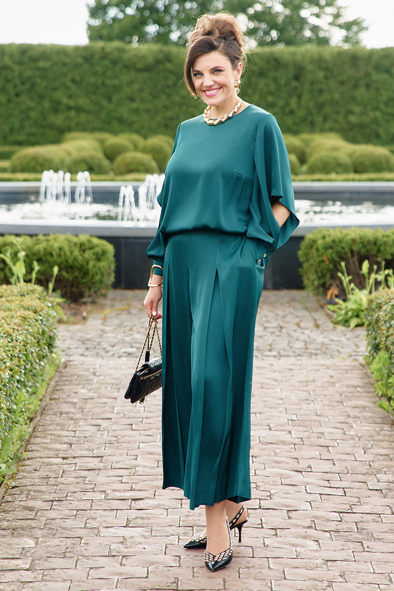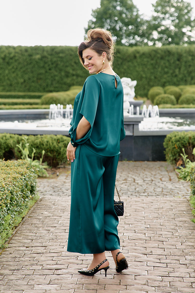 Глубокий зеленый цвет окутывает фигуру, переливаясь благородным матовым блеском.Костюм женский, состоящий из блузки и брюк-кюлот.