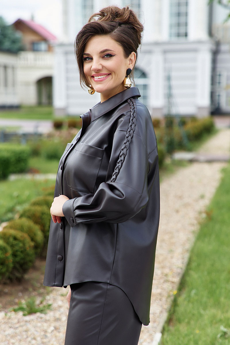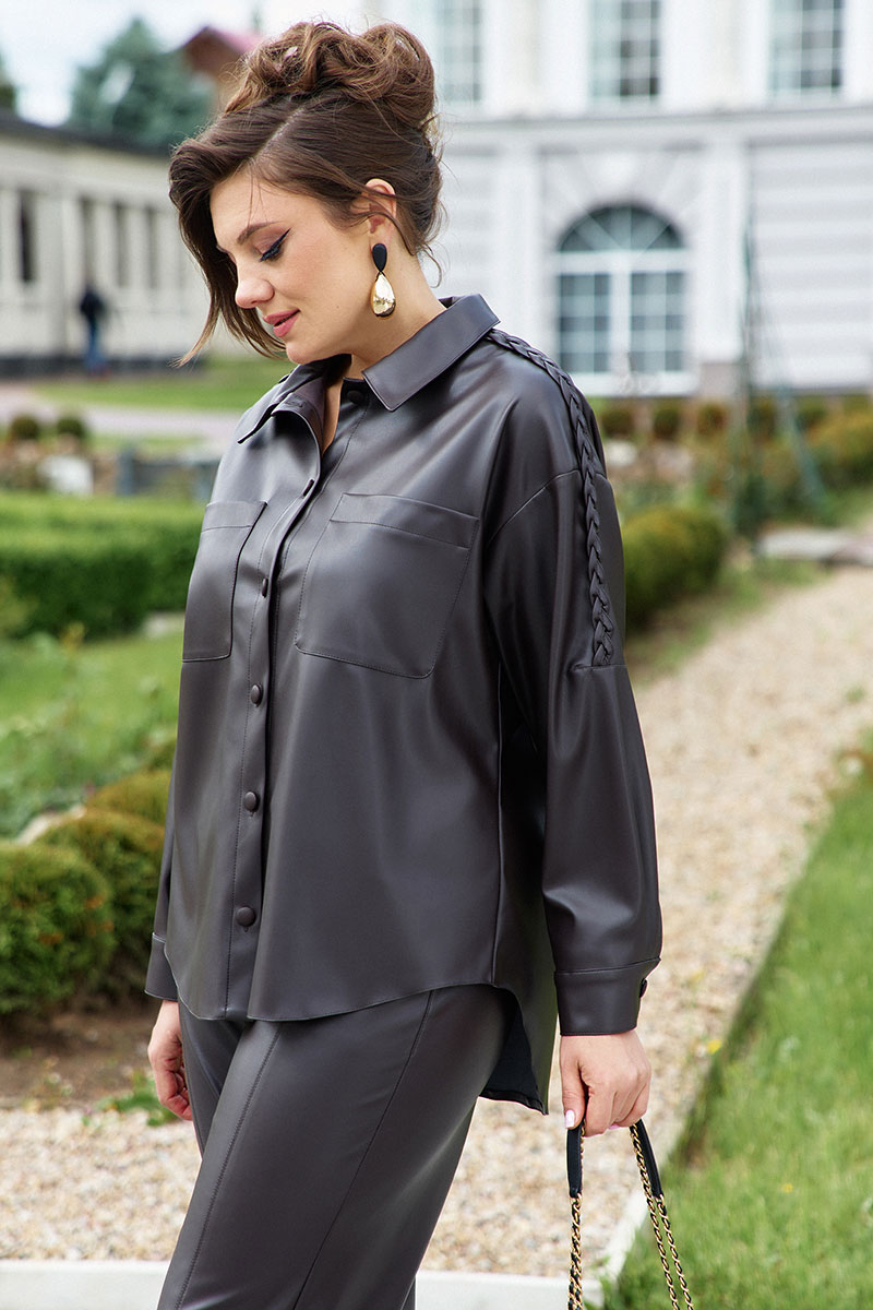 Рубашка - не просто верх, а главный акцент. Кожа, плотная, но податливая, образует «оверсайз» силуэт. Плечо, от места втачивания воротника и до вытачки по рукаву, украшены декоративными косичками из кожаных тесёмок. По переду рубашки застёжка на декоративные пуговицы в тон ткани по планке, и накладные карманы. Воротник рубашечного типа. Линия плеча спущенная. Спинка в рубашке с отрезной кокеткой. Рукав втачной, длинный с локтевым швом и разрезом от низа; заложенной складкой от низа и притачной манжетой. Низ в рубашке ассиметричный.