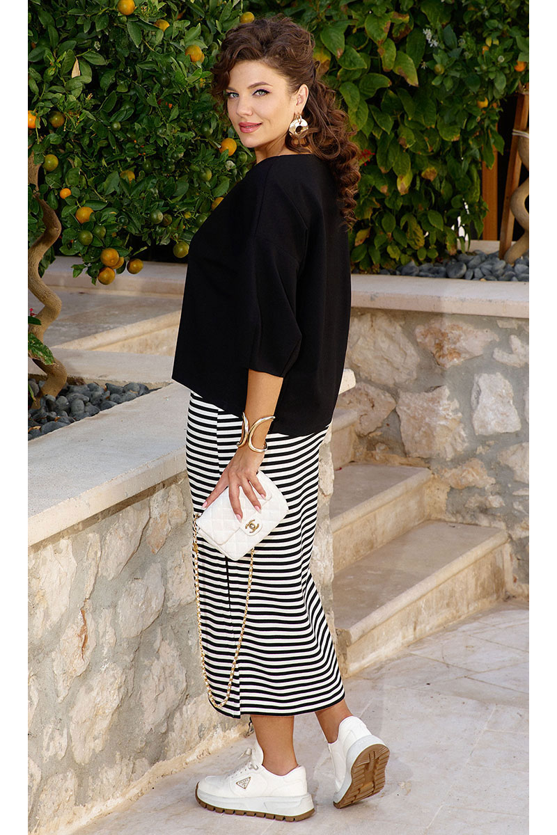 Стильный и универсальный комплект идеально подойдёт для тёплых осенних дней. Благодаря своему удобству и универсальности, этот комплект станет отличным выбором для повседневной носки, а так же для создания разнообразных образов в зависимости от настроения и ситуации. Комплект состоит из однотонной блузки чёрного цвета и юбки в полоску длины «миди».