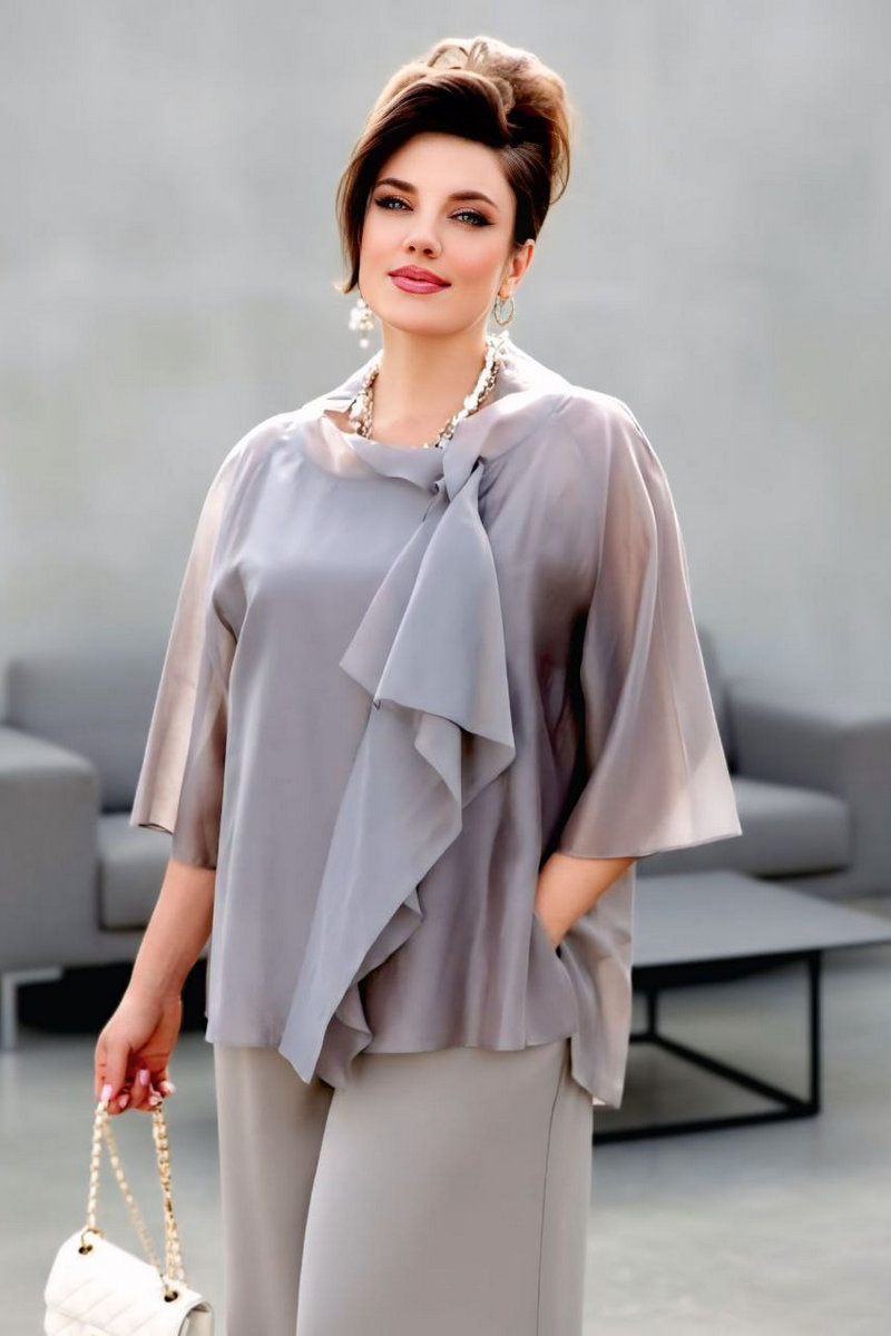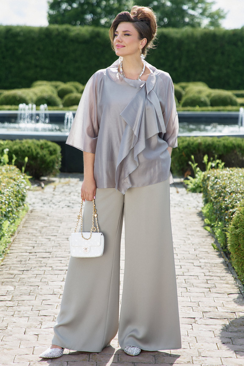 Брюки с высокой посадкой и струящимся кроем визуально удлиняют ноги, создавая безупречный и гармоничный ансамбль. Этот костюм идеально подходит как для торжественных мероприятий, так и для деловых встреч, подчеркивая ваш безупречный вкус и чувство стиля.