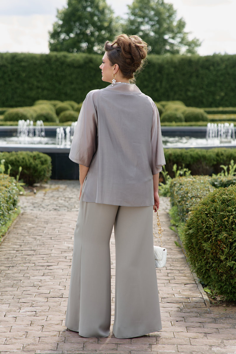 Элегантный брючный костюм, выполненный в мерцающем оттенке, который идеально подходит для создания утонченных образов. Комплект состоит из свободной блузы широких брюк палаццо, обеспечивая непревзойденный комфорт и легкость движений.