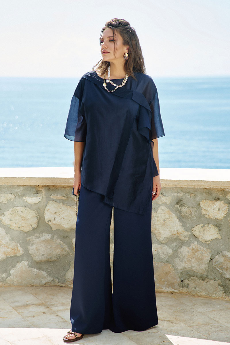 Широкие брюки глубокого синего оттенка, свободно свисают, создавая плавные линии и элегантную силуэтность. Ткань, из которой они выполнены, обладает текстурой, придавая образу нотку роскоши и комфорта. Брюки идеально подчеркивают фигуру, создавая стильный и уверенный вид. Брюки свободного силуэта, расширяются к низу. Пояс притачной на резинке, что обеспечивает максимально удобную посадку на любой тип фигуры, в боковых швах карманы.