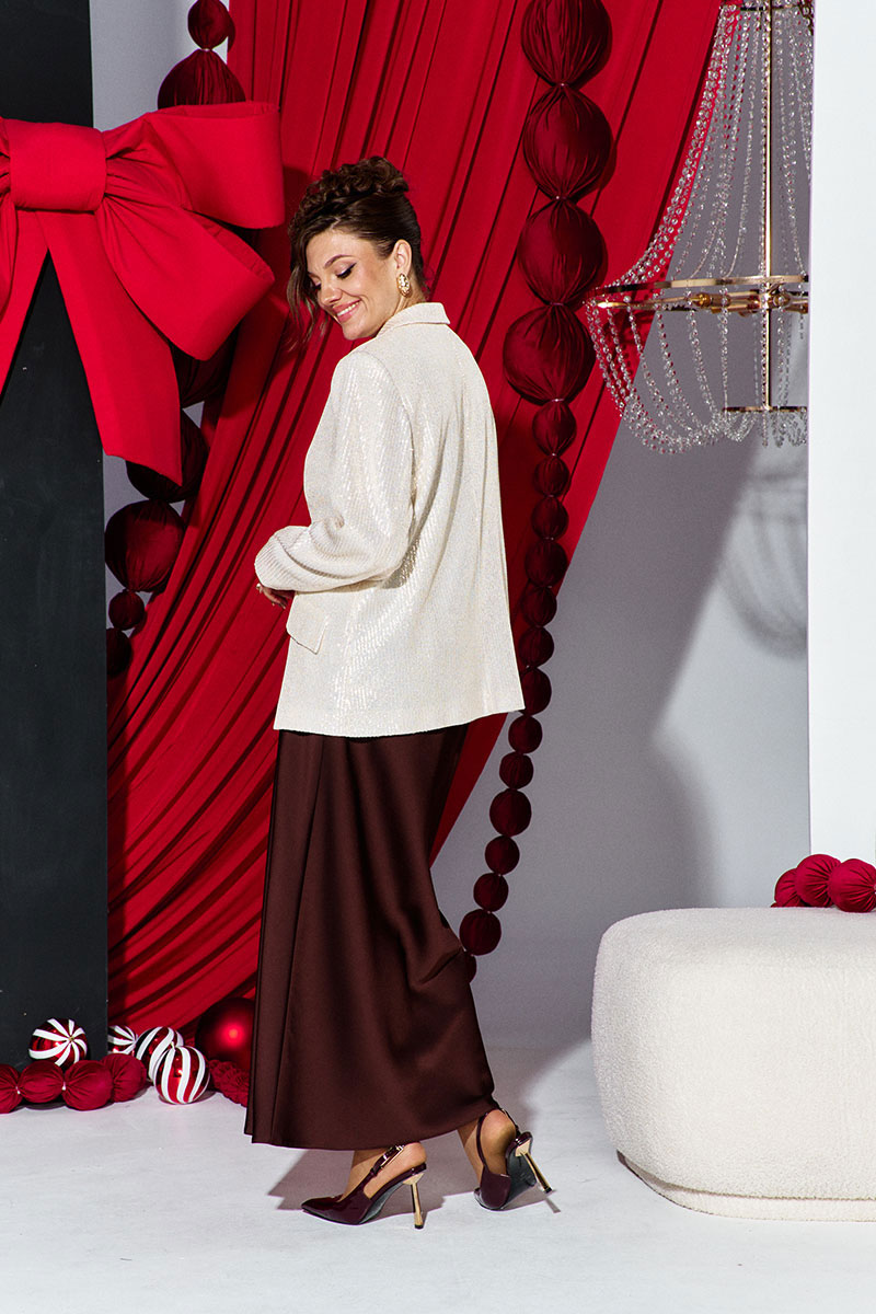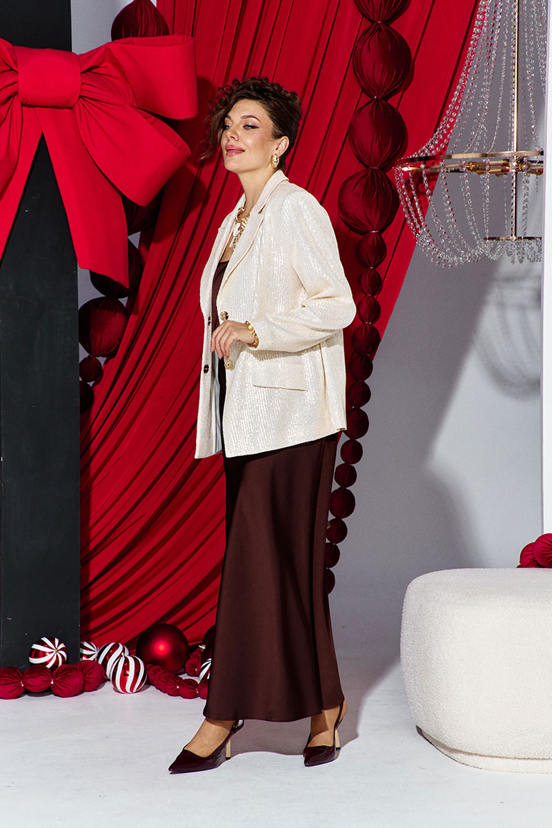 Комплект рождает образ женщины, которая умеет сочетать роскошь и стиль, держась на грани между ярким светом и глубоким шоколадом, между блеском и бархатной степенью. Женский комплект состоит из жакета, вся поверхность которого сияет золотистыми пайетками, а так блузы и юбки силуэта «рыбка» в модном цвете сезона—шоколаде.