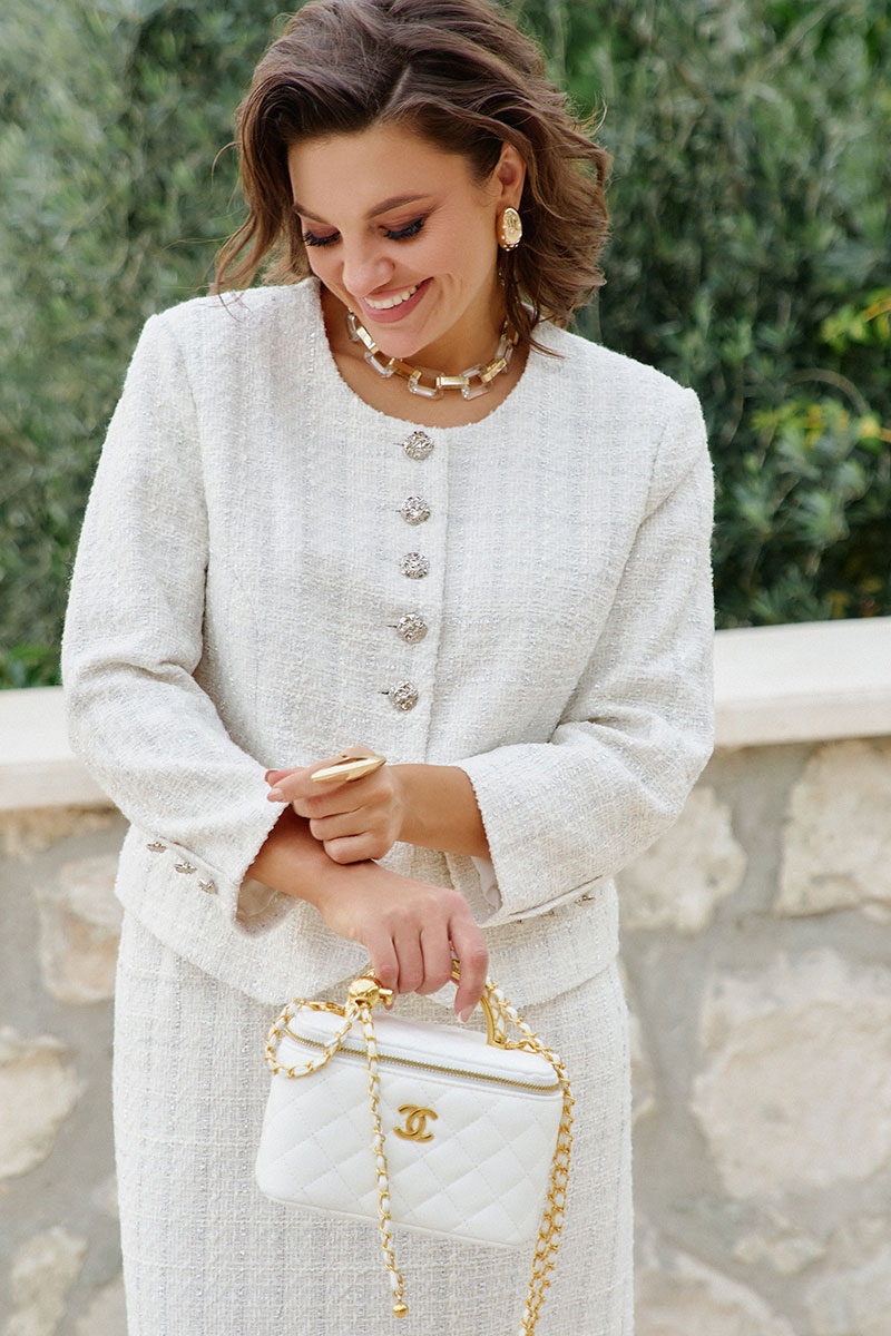 Представляем воплощение женственности и классической элегантности — изысканный твидовый костюм в нежном розовом оттенке. Этот костюм идеально подходит для деловых встреч, торжественных мероприятий и создает образ элегантной и стильной женщины. Он не только подчеркивает достоинства фигуры, но и дарит ощущение комфорта и роскоши. Костюм женский, двухпредметный, состоящий из укороченного жакета и юбки-карандаш, создавая безупречный и утонченный образ. Основа ткани — роскошный твид, в который искусно вплетена тонкая люрексовая нить, придающая полотну деликатное мерцание и благородный блеск.