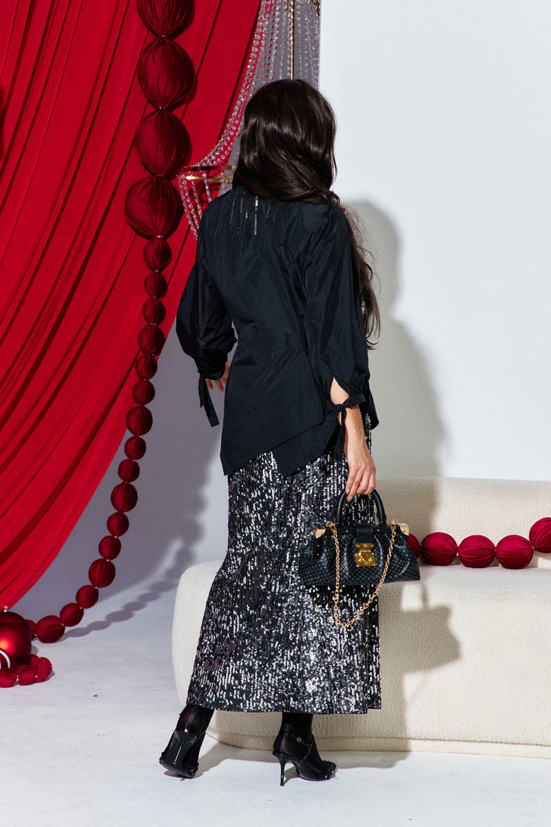 Потрясающий юбочный комплект, состоящий из блузки и юбки, который подарит вам ощущение праздника и непринуждённости. Ассиметричный крой блузы отлично гармонирует с ярким в пайетки низом, создавая тем самым идеальный комплект. Блуза прямого силуэта с запахом на поясе завязке с декоративным элементом в виде вышивки на какетке спинки. Горловина V-образная, воротник рубашечный с дизайнерским решением. С фигурными рельефами по переду и ассиметричным низом. Спинка блузки с рельефом и с запахом внизу. Рукав втачной одношовный по низу со сборкой и манжетом с завязкой. Юбка прямого силуэта. Пояс цельновыкроенный с эластичной тесьмой, что обеспечивает максимально комфортную посадку на любой тип фигуры. Юбка на трикотажной подкладке, по низу со внутренней стороны обтачка из подкладочной ткани для максимального удобства.