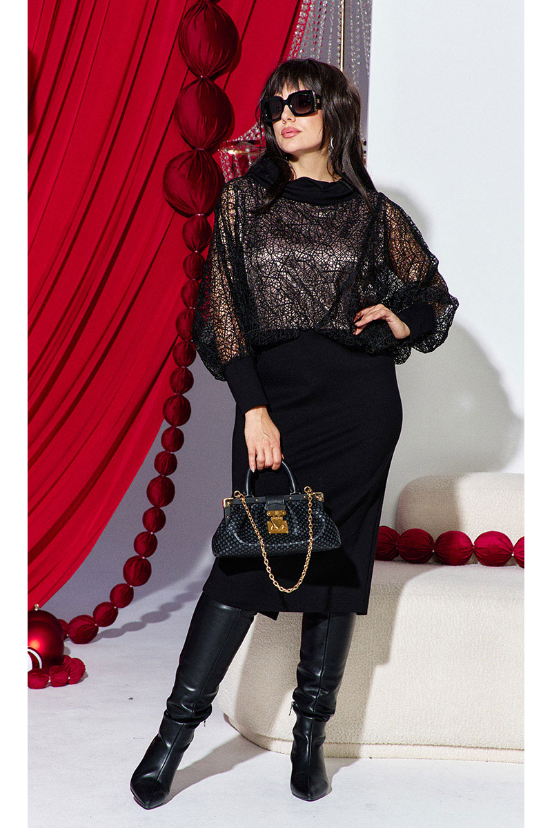 Платье-загадка. В нём ажурная невесомость чёрной сетки на лифе встречается с архитектурной чёткостью воротника-хамута, собранного в изящные защипы. А от него вниз устремляется матовый поток юбки-карандаш, строгий, безупречный и невероятно соблазнительный в своей простоте. Это платье создано для тех, кто знает силу намёка. Глубокий чёрный цвет здесь не просто окрас, а целая история. Высокий воротник-хамут, пронизанный лучами защипов, обнимает шею, как роскошный ошейник, придавая образу отстранённое благородство и лёгкий флёр декаданса. И в противовес воздушному лифу — юбка-карандаш. Сшитая из плотного, послушного трикотажа, она властно лепит форму, подчёркивая линию бёдер и строгость силуэта. Это диалог нежности и строгости, соблазна и сдержанности. Платье полуприлегающего силуэта, отрезное выше уровня талии. Лиф в платье из сетки, с диагональным рельефом по переду. Рукав в платье цельнокроеный со сборкой на высокий манжет. Для удобного прилегания к руке в манжете застёжка на потайную тесьму молнию. Горловина округлой формы с притачным воротником по форме хомут. Лиф в платье с напуском на юбку платья. Юбка в платье со средним швом по спинке переходящим в разрез от низа.