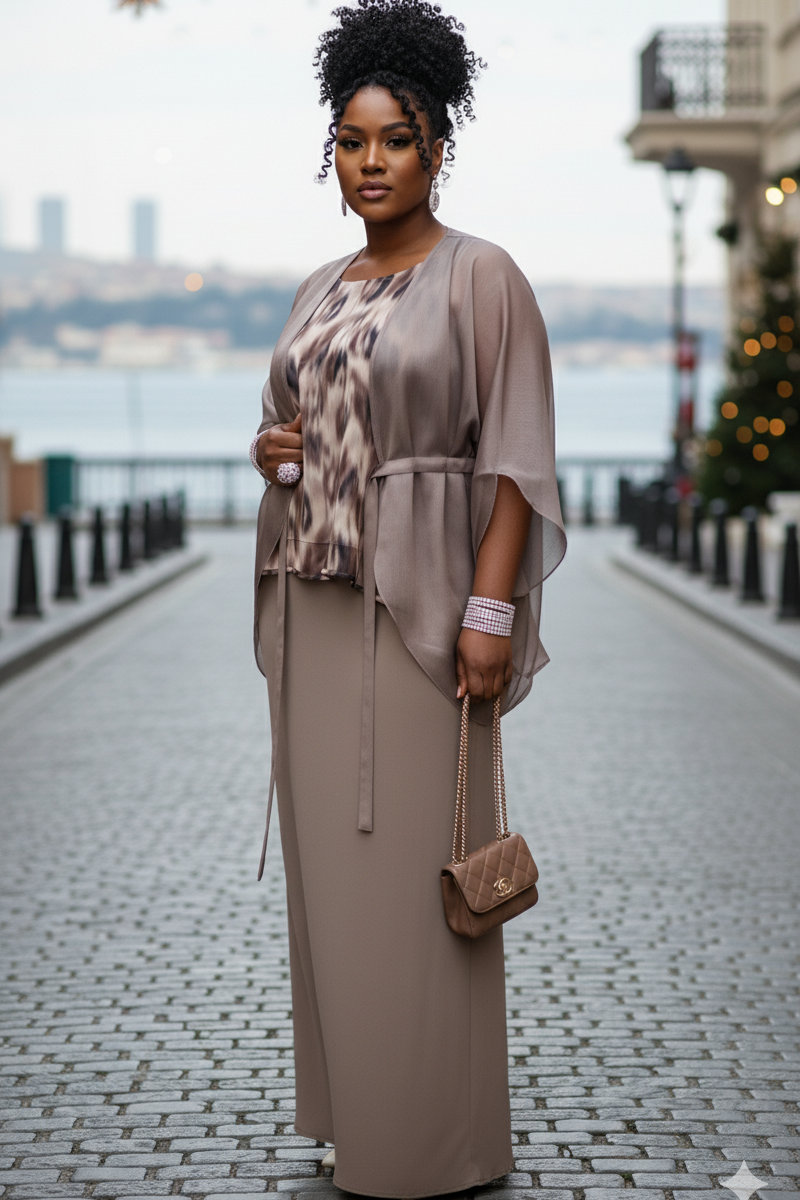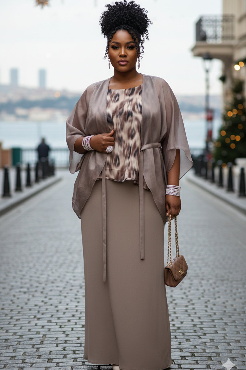 Очаровательный юбочный комплект, состоящий из вуалевой накидки шифонового топа и удлинённой юбки по косой. Максимально романтичный образ для праздничного выхода.