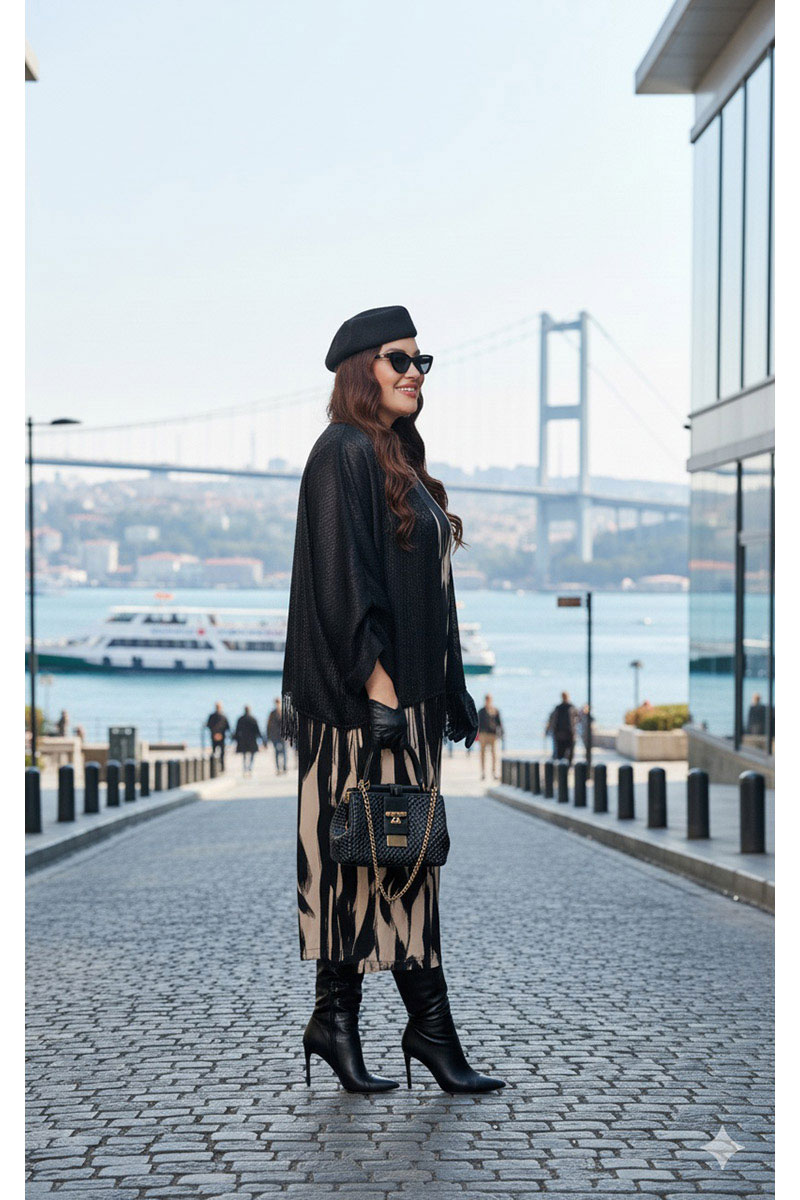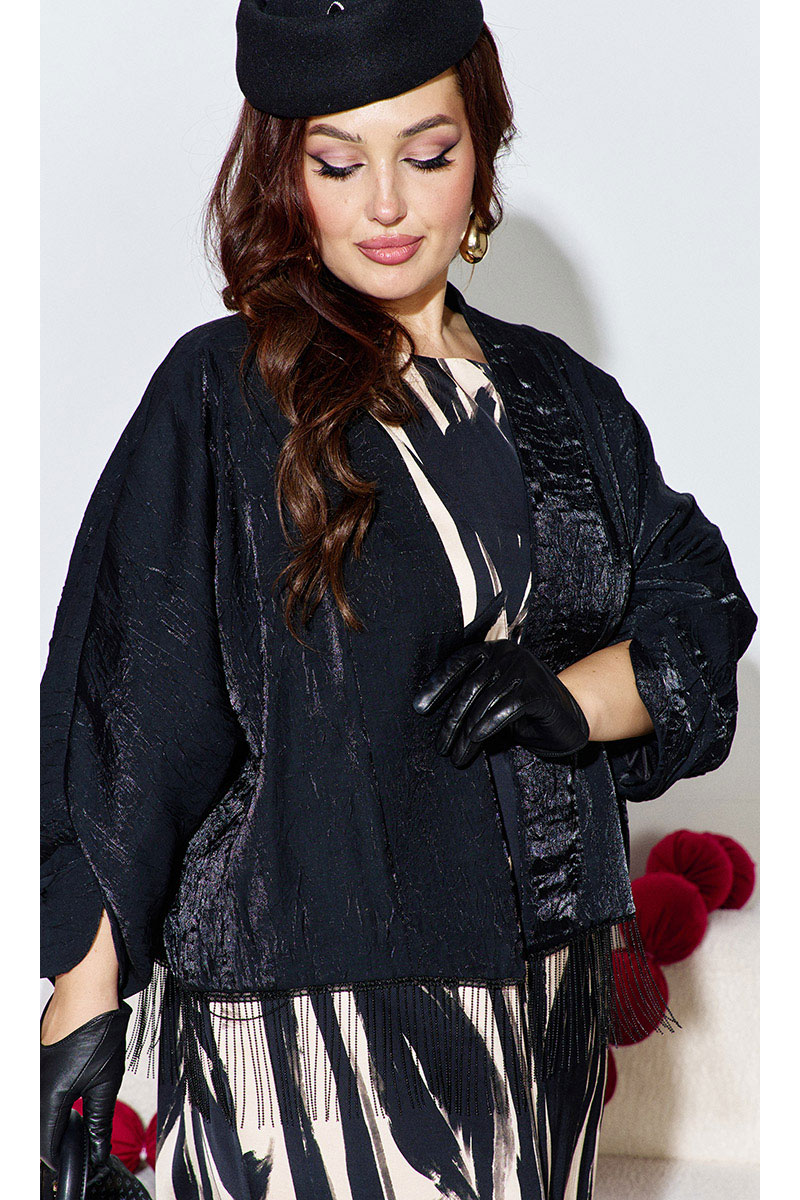 Жакет прямой свободного силуэта с цельнокроеным рукавом, перед без застежки с широкой линии борта и не высокой цельнокроенной стойкой. Низ переда обработан декоративной тесьмой - бахрома. По рукаву декоративная складка низ рукава фигурной формы. Спинка по среднему шву со встречной складкой. Жакет выполнен на подкладке.