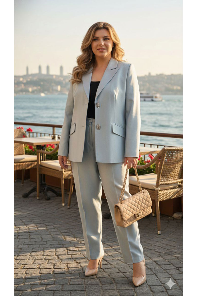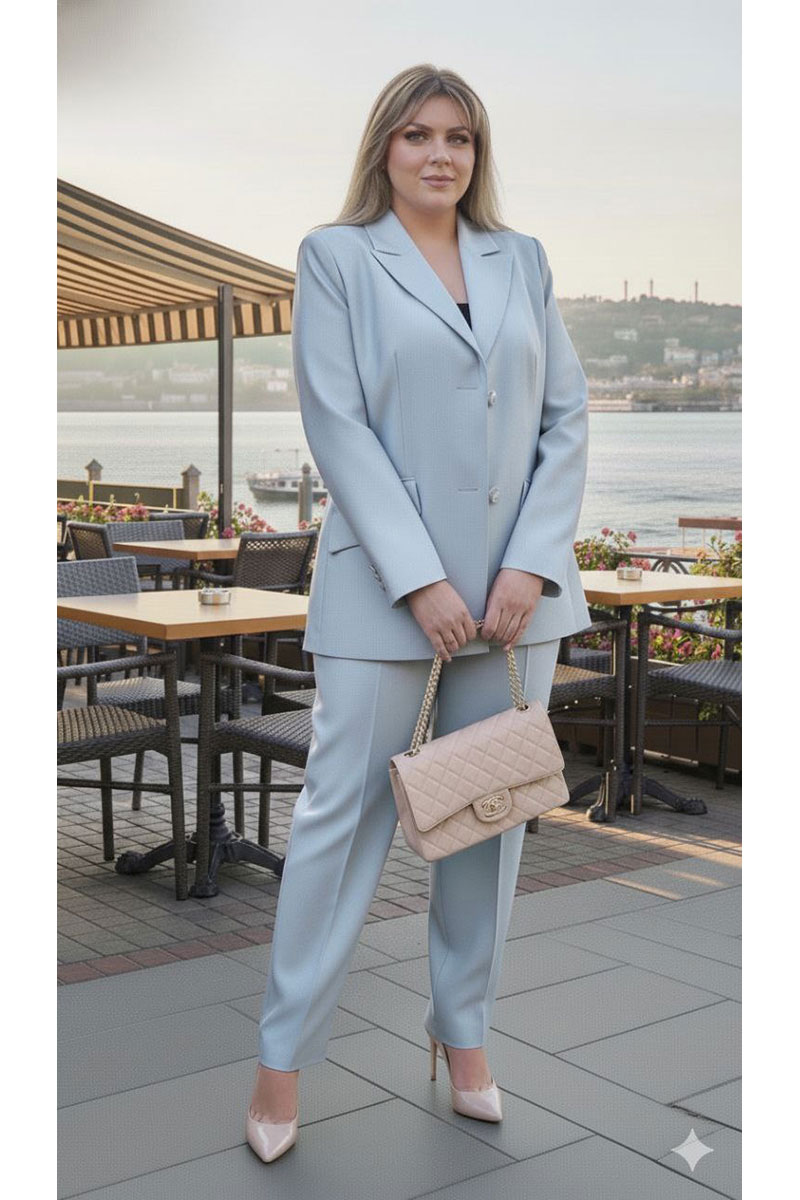 Ткань с мерцающим отливом, не кричащим, а лишь намёком напоминающим о вечернем свете. Это костюм для женщины, которая ценит безупречность линий, но не боится лёгкого сияния. Он струится по фигуре, как жидкий шёлк, переливаясь при каждом движении — элегантный, сдержанный, но не лишённый изысканной роскоши.