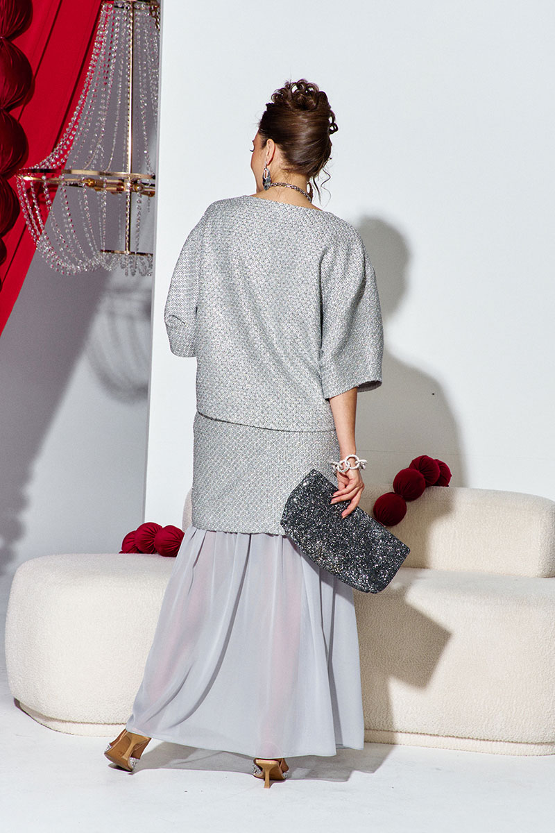Это стильный и современный юбочный костюм, созданный для особого случая. Он состоит из трёх частей: блузы, верхней и нижней юбки. Основу ткани составляет роскошный твид глубокого серого цвета с металлическим блеском, в который искусно вплетена деликатная люрексовая нить, придающая полотну благородное мерцание. Он не только подчеркивает достоинства фигуры, но и дарит ощущение комфорта и роскоши.