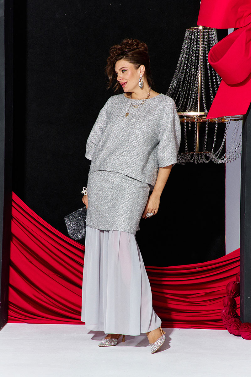 Юбка представляет собой многослойную конструкцию: верхний слой выполнен из той же блестящей ткани, что и блуза, и имеет прямой силуэт мини-длины. Нижний слой — это длинная, струящаяся юбка-макси из полупрозрачного, лёгкого шифона серого цвета. Такое сочетание фактур и длин создаёт интересный и динамичный образ. Верхняя юбка длины мини, прямого силуэта с притачным поясом со вставкой эластичной тесьмы- резинки в бочках. В среднем шве юбки застёжка на потайную тесьму-молнию и пуговицу в поясе. Юбка на подкладке. Нижняя юбка длины миди, со сборкой на резинку по верхнему срезу, с притачным воланом со сборкой от подреза.