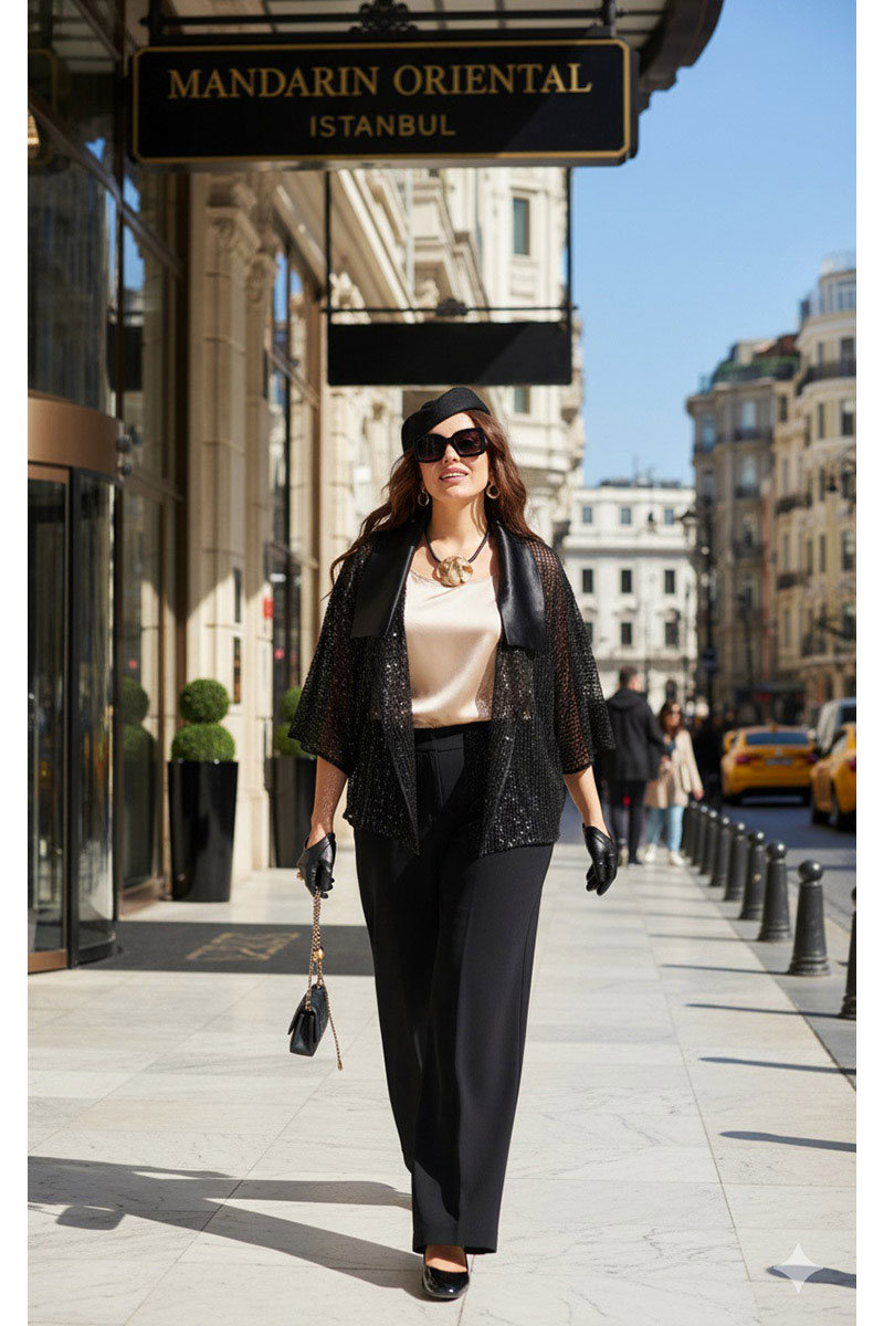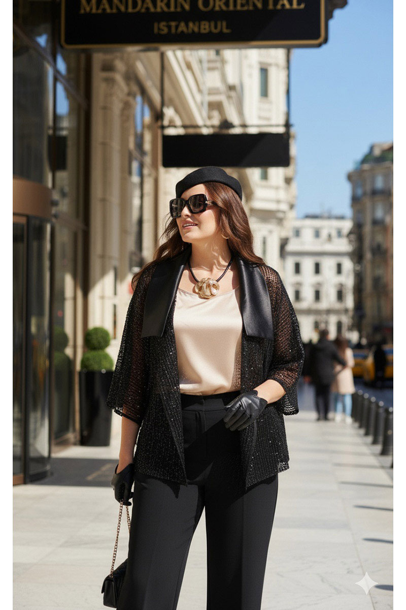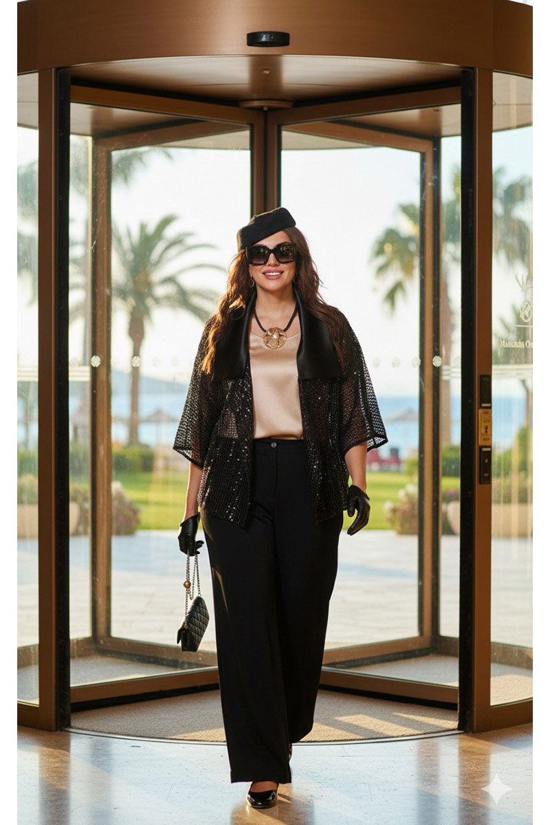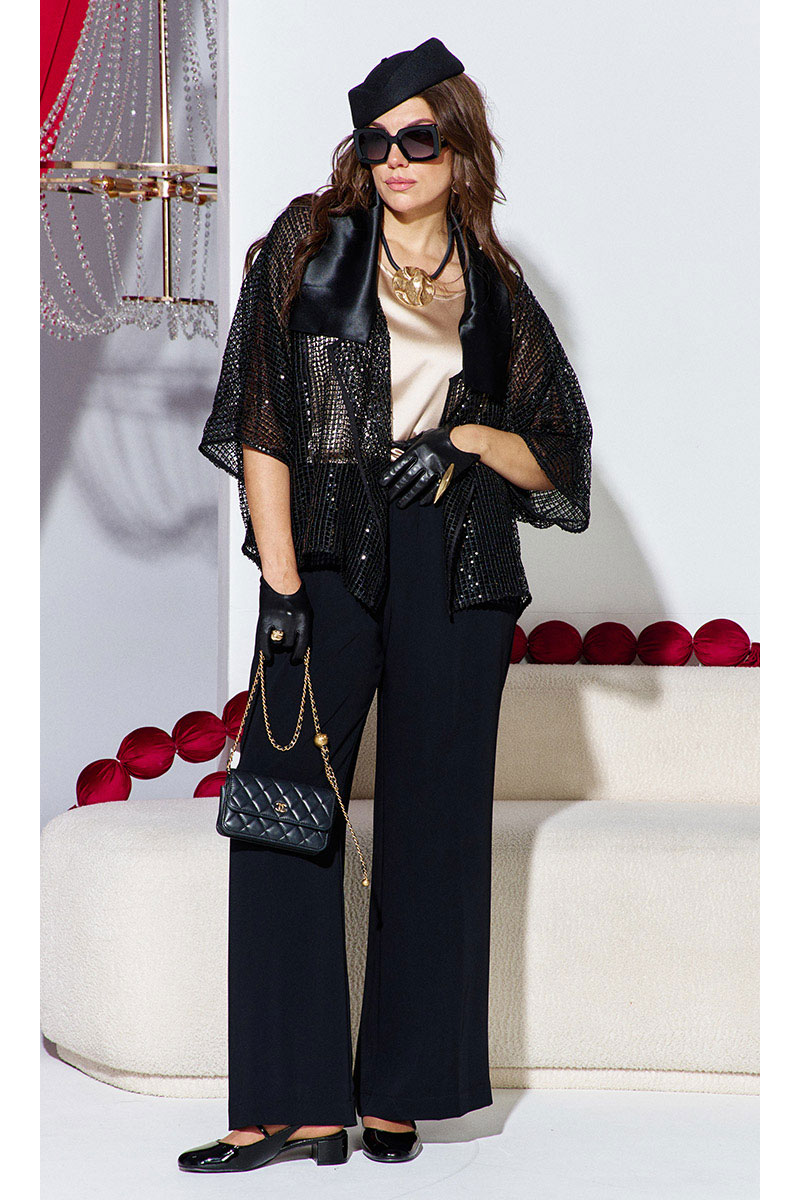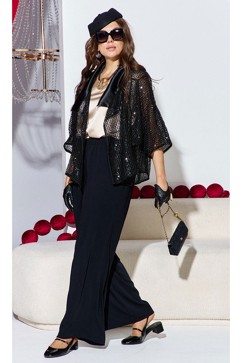 Жакет продолжает линию плеча и свободно свисает до середины бедра, образуя мягкую, расслабленную форму. Это не просто вещь, а диалог материалов: матовая глубина сетки и искрящийся блеск пайеток соединяются с атласным воротнико, создавая ансамбль, который легко адаптируется под вечерний выход. Жакет «оверсайз» силуэта с ассиметричной линией борта, отложным воротником из отделочной ткани. Линия плеча в жакете спущенная. Рукав втачной, длиной ¾. Спинка без особенностей. Жакет на подкладке.