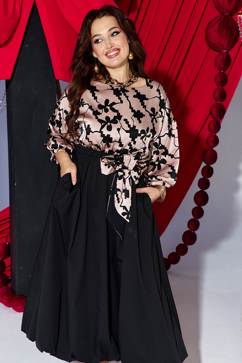 Невероятно красивое и элегантное платье отвечает всем требованиям вечернего наряда! Сочетание тканей разных фактур и дизайнов в одной модели - тренд сезона. Для лифа с мягкими присборенными рукавами мы выбрали пластичный атлас, а формоустойчивую тафту - для создания модной юбки «баллон». Сдержанный блеск атласа с деликатным принтом подчеркивает глубину тона черной тафты. Платье отрезное по талии, с круглой горловиной. Рукав длиной 7/8 со спущенной проймой и сборкой по низу на резинку. Длинная юбка «баллон» собирается по талии на эластичную ленту в отрезном поясе. По поясу платье декорировано бантом в виде съемной броши.