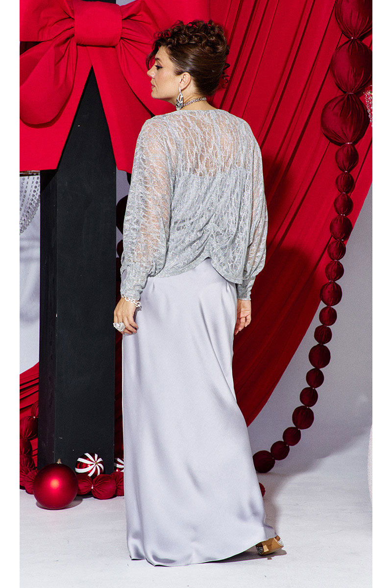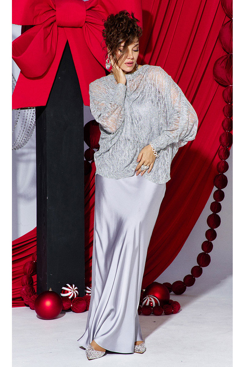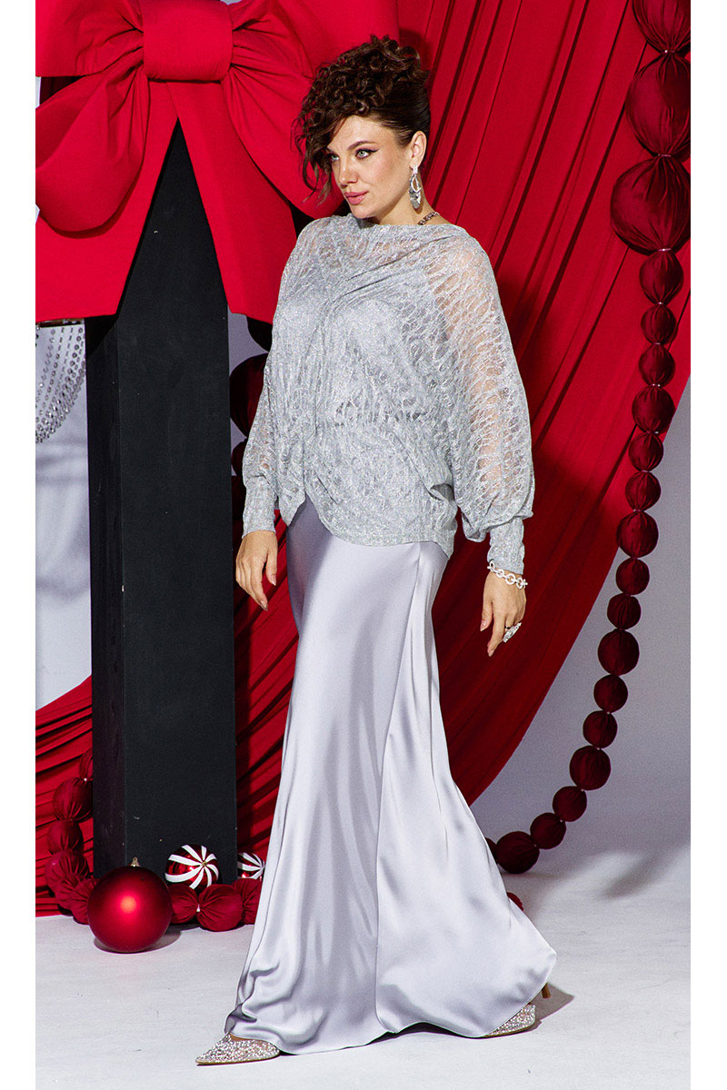 Юбка атласная в стальном металлическом оттенке добавляет образу холодной свежести и энергетического акцента. Юбка длины «миди» с притачным поясом, вставкой эластичной тесьмы-резинке в задней части пояса и застёжкой на потайную тесьму-молнию в боковом шве и пуговицу в поясе.