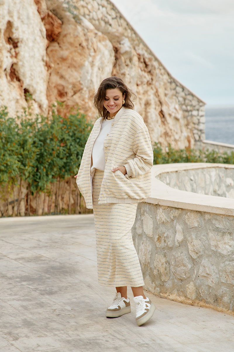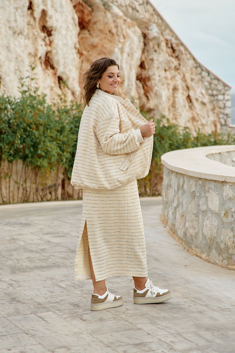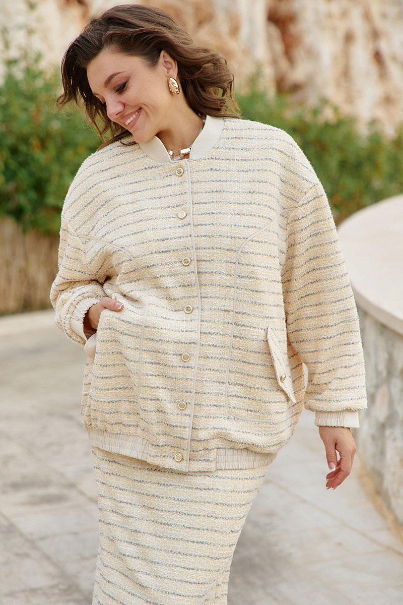 Бомбер- это идеальный переходный элемент. Это выбор для тех, кто ценит комфорт и современные силуэты. Светлый оттенок мгновенно освежает любой базовый образ (с джинсами, брюками, платьем) дополняя и добавляя ему стильности. Бомбер «оверсайз» силуэта с центральной застёжкой на петли пуговицы по краю борта, горловина округлой формы с воротником-стойкой из отделочной ткани. По переду бомбера фигурный рельеф с декоративным отделочным кантом из отделочной ткани, функциональными карманами с клапаном. Спинка без особенностей. Линия плеча спущенная, рукав втачной, длинный со сборкой на притачной манжет из отделочной ткани. Для удобного прилегания манжета к руке вставка резинки. По низу бомбера притачной пояс на резинке из отделочной ткани. Бомбер на подкладке.