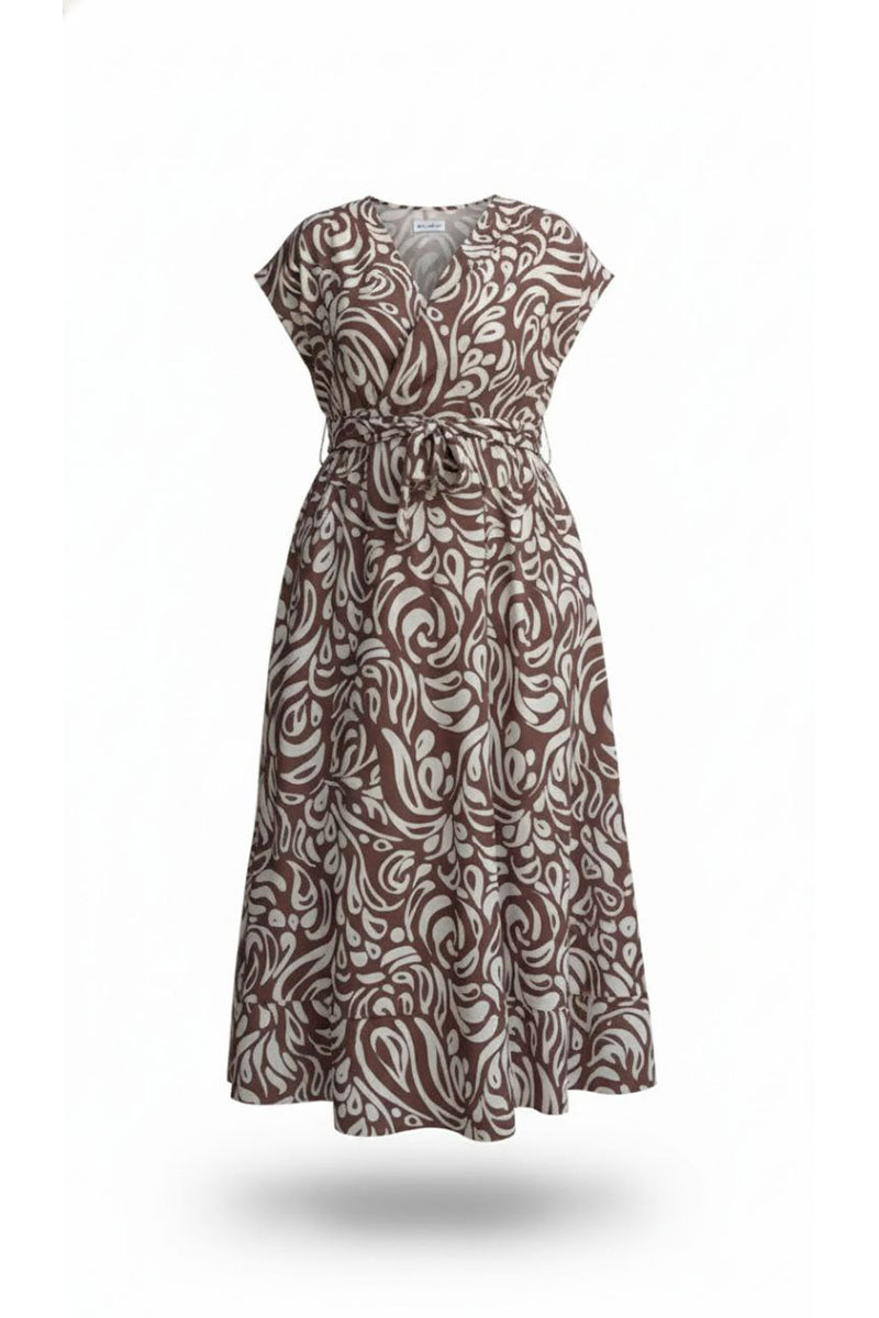 Это платье — словно воплощение самой сути лета, легкое и воздушное, созданное для солнечных дней и теплых вечеров. Оно сочетает в себе классическую элегантность силуэта с современной лаконичностью кроя, создавая образ одновременно романтичный и утонченный. Ткань достаточно плотная, чтобы держать форму, но при этом легкая, чтобы колыхаться при ходьбе. Платье прилегающего силуэта, с отрезным лифом, вставкой декоративной тесьмы-резинки переходящей на спинку платья. Горловина в платье с плавным V-образным вырезом, по переду и спинке платья— средний шов. Рукав в платье цельнокроеный, короткий. В качестве главного декоративного элемента, который задаёт настроение всему изделию идёт пояс, который драпируется по лифу и фиксируется по талии. Тем самым можно самостоятельно регулировать степень прилегания, чувствуя себя максимально комфортно. В боковых швах юбки платья карманы.