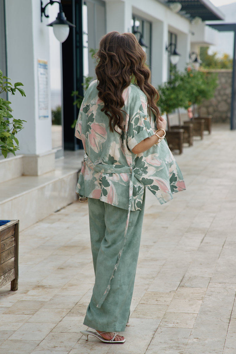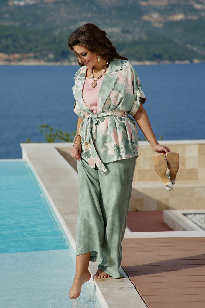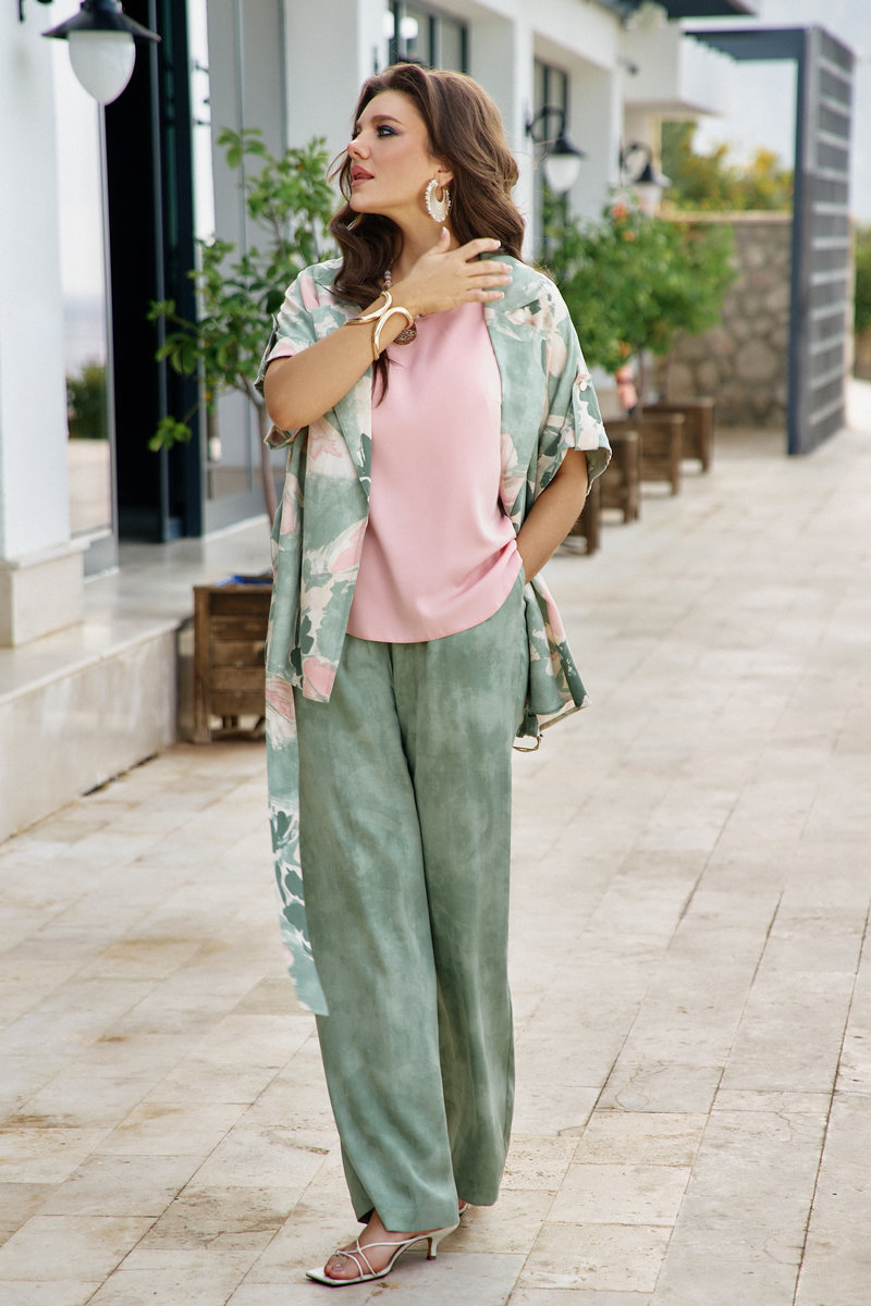 Жакет с цветочным принтом и прямые брюки пастельного оттенка в тон, месте они создают гармонию, где каждая деталь дополняет другую, а не перетягивает внимание. Блуза прямого силуэта является акцентным пятном в данном комплекте. Горловина округлой формы, по переду нагрудные вытачки. Спинка без особенностей. В боковых швах от низа блузы разрезы.