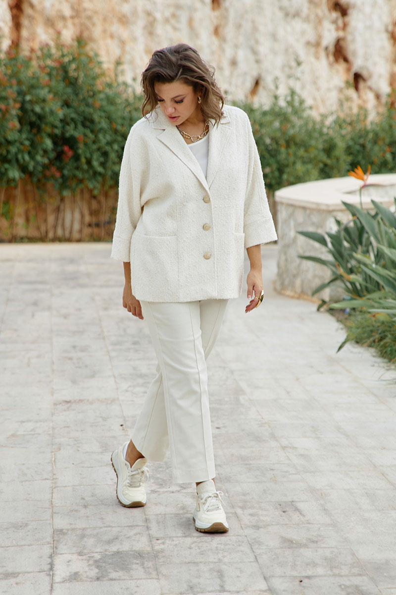 Брюки молочного оттенка — это про лёгкость решений. Они дарят ощущение чистоты и порядка, но без строгости. Это вещь для тех, кто ценит уютную элегантность и хочет выглядеть продуманно, но непринуждённо. Служат основой для минималистичных ансамблей и для более смелых цветовых сочетаний, универсальны — выглядят органично и летом, и в межсезонье. Брюки призаужены к низу, по переду застрочен кант, в брюках прорезные карманы по верхней части, застежка на молнию в гульфике и джинсовую пуговицу по центру пояса. Пояс притачной, на резинке по бокам. На задней части брюк фигурная кокетка и накладные карманы.