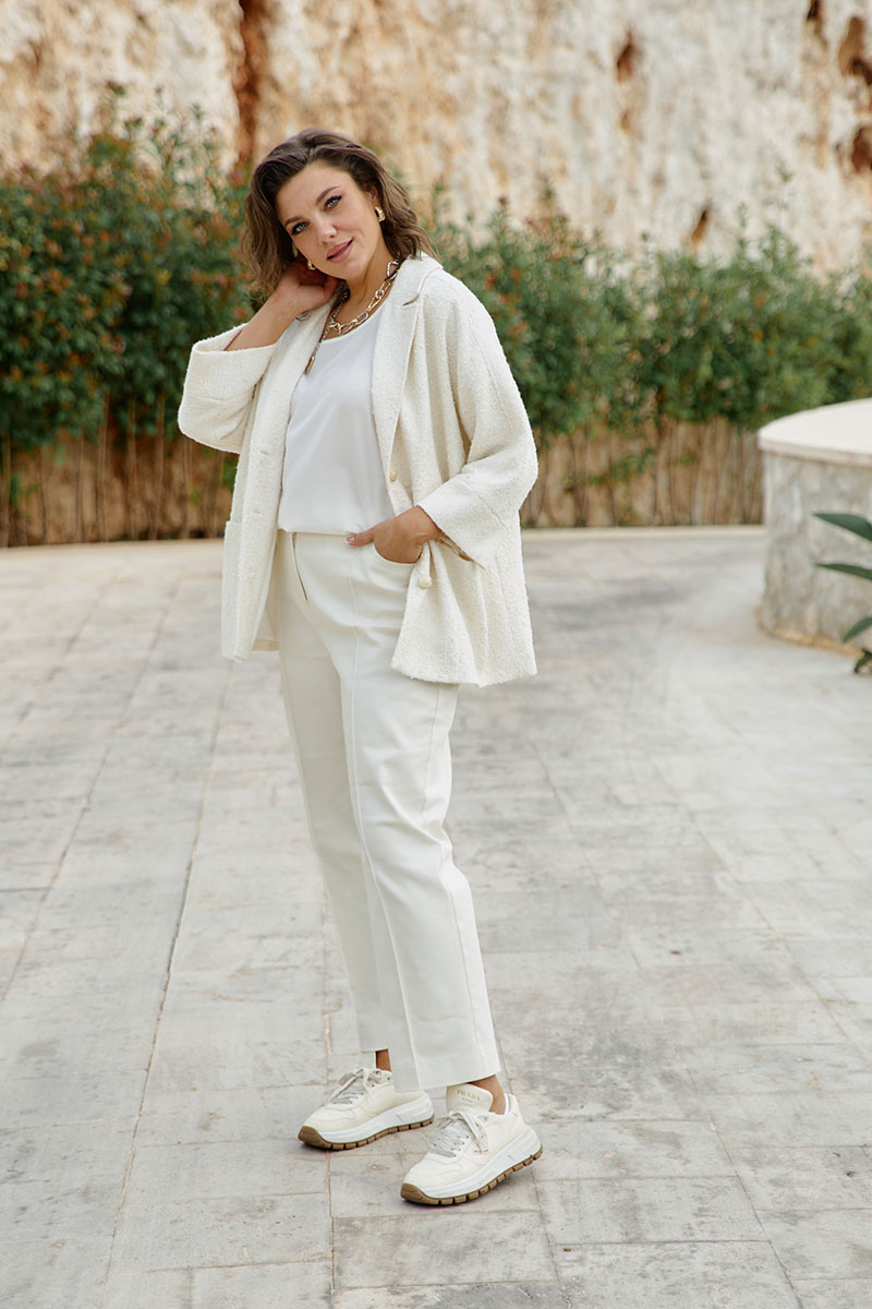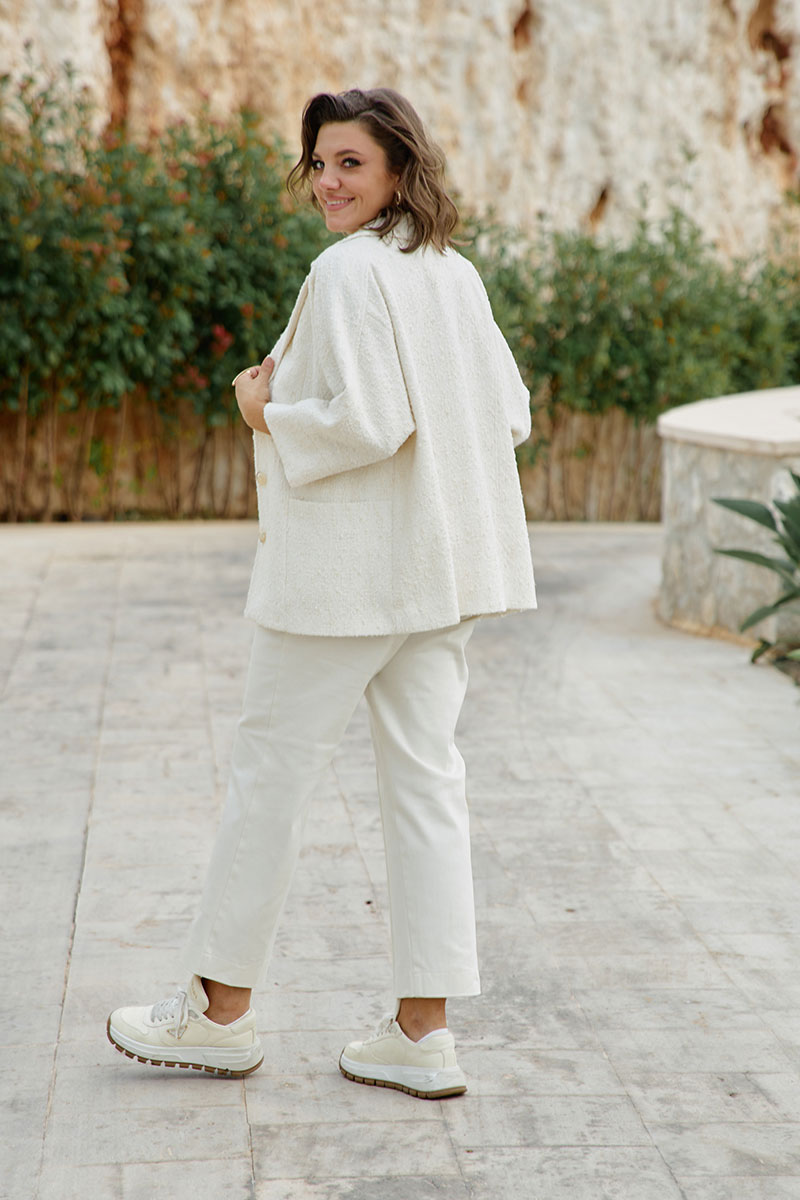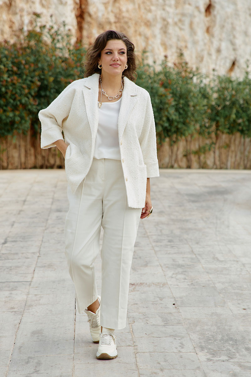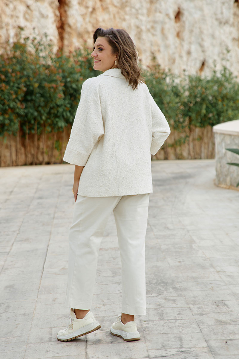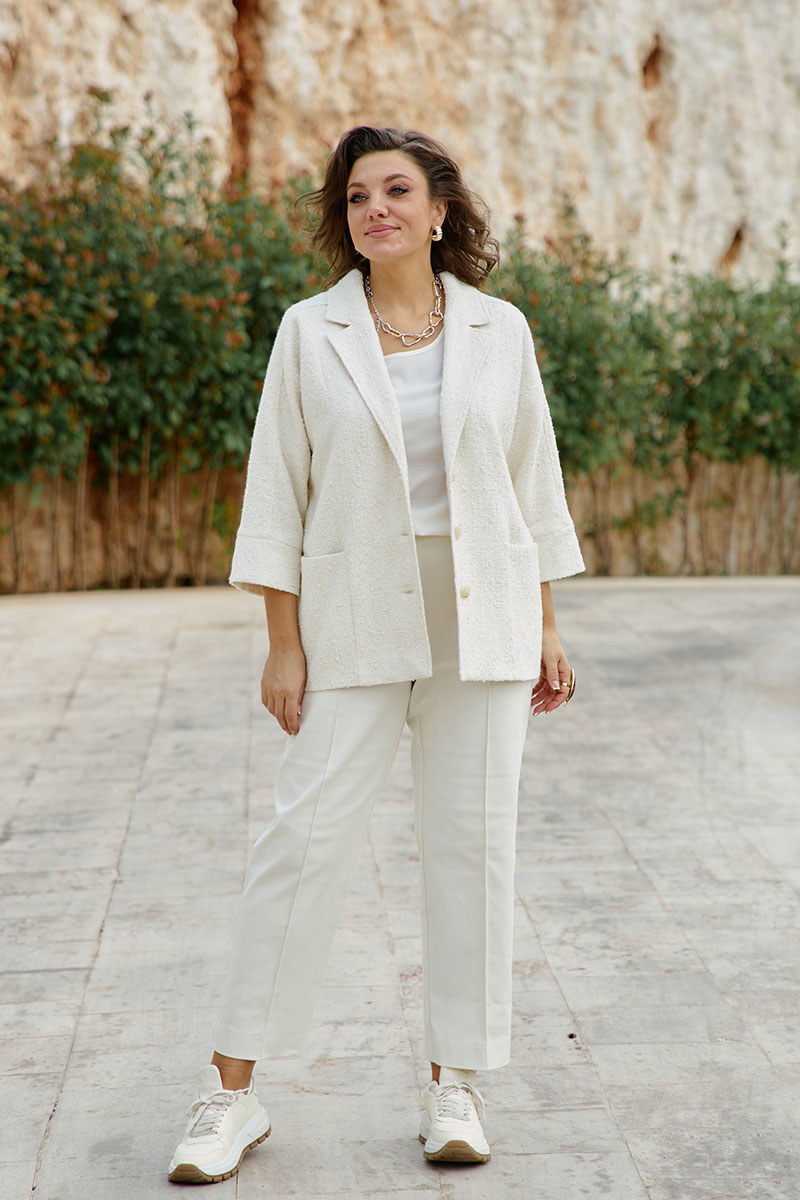 Этот жакет — мягкая архитектура уюта и стиля. Сливочный тон словно согревает взгляд, а рельефная фактура придаёт образу тактильную выразительность: он одновременно строг и ласков, деликатно подчёркивает вкус женщины, которая выбирает комфорт без лишней демонстрации. Жакет прямого силуэта, с центральной бортовой застёжкой по борту на петли-пуговицы. По переду рельефы и накладные карманы, воротник пиджачный отложной с лацканом. Спинка с вертикальными рельефами. Рукав цельнокроеный с поперечной вставкой, низ с манжетом длина 3/4 . Жакет на подкладке. Данная модель жакета в стильном оттенке идеалена для межсезонья в качестве верхнего или среднего слоя.