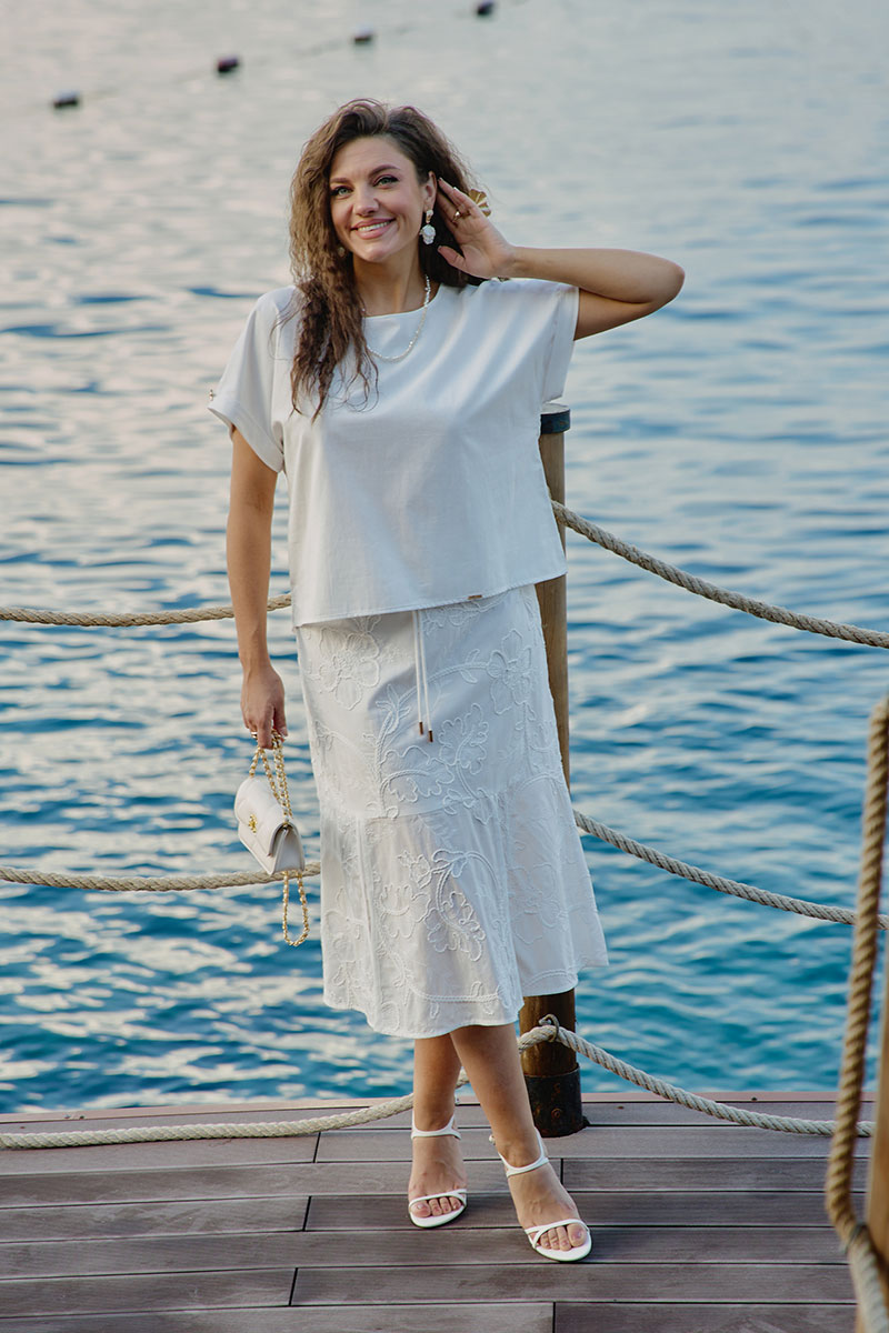 Женский летний костюм из легкой однотонной ткани в сочетании с изысканным ришелье Блуза свободного прямого силуэта, с округлой формой горловины, линия плеча спущенная с отложной манжетой по низу фиксируется декоративной пуговицей в качестве отделки. Спинка в блузе с отрезной кокеткой из отделочной ткани ришелье, на просвет, декоративной застёжкой на петли пуговицы. Низ в блузе ассиметричный с разрезами в боковых швах и пришивным декоративным элементом по низу переда. Юбка выполненная в трапециевидном силуэте, плавно ниспадает от талии, создавая ощущение легкости и свободы. Юбка из ришелье добавляет текстуру и эффектный контраст с однотонным верхом. Верхняя часть юбки с отрезной кокеткой, вставкой венгерки по задней детали, декоративными шлёвками и шнуром от боковых швов. В боковом шве юбки застёжка на потайную тесьму-молнию. По низу юбки притачной волан с разведением и декоративными разрезами по переду. Обращаем Ваше внимание, что фурнитура может незначительно отличаться от фото.